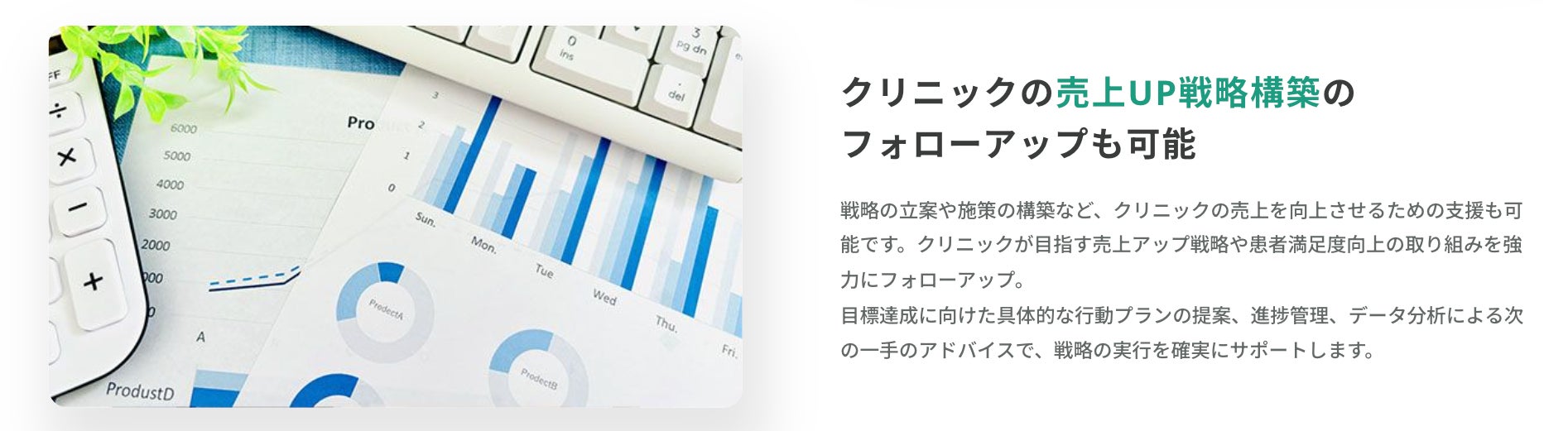 クリニックで抱える煩雑な業務をはじめ、レポート作成で使用する解析ロジックの作成やLP制作、動画制作、SNS投稿等の集客支援業務も依頼可能です。クリニックの売上UP戦略構築のフォローアップも可能。