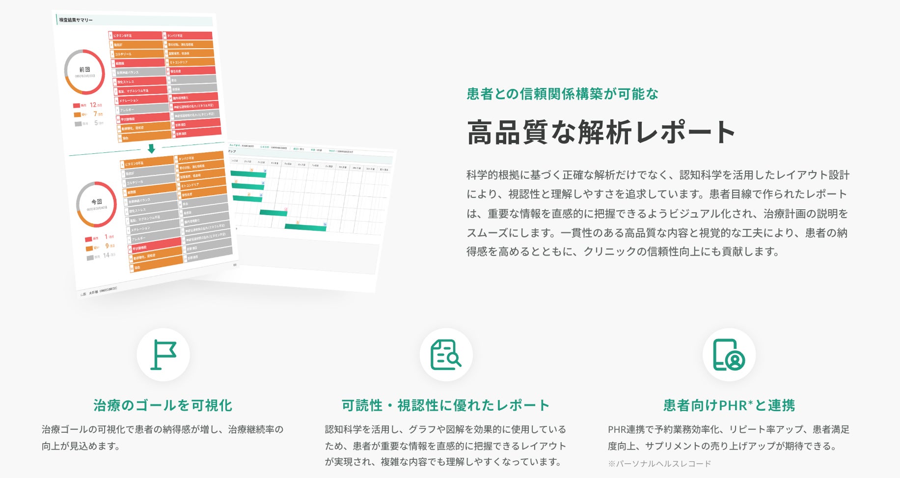 さらに、従来の栄養解析ツールと異なり、臨床分子栄養医学研究所の個別化健康増進コースのアルゴリズムを搭載したロジックを組み込んだ高度なレポート生成機能をアドオンとして提供。これにより、診療の質を飛躍的に向上させることが可能になります。