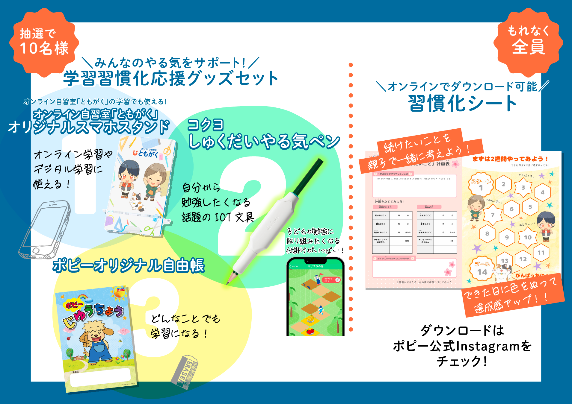 応募していただいた方の中から抽選で、学習習慣化応援グッズとして、「①ともがくオリジナルスマホスタンド」「②しゅくだいやる気ペン」「③ポピーオリジナル自由帳」の3点をセットにして、10名様へプレゼントいたします。また、習慣化をめざす親子でのコミュニケーションを活発化していただくための「習慣化シート」をダウンロードにて全員にプレゼントいたします。