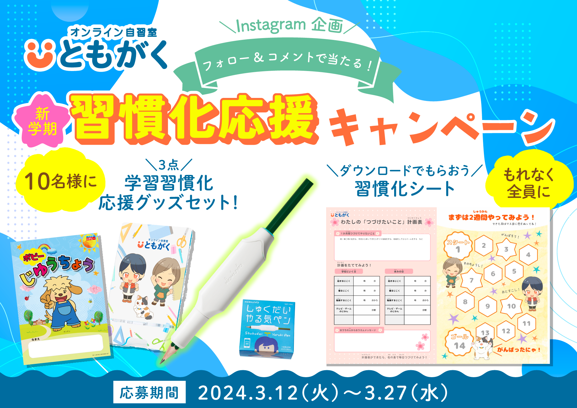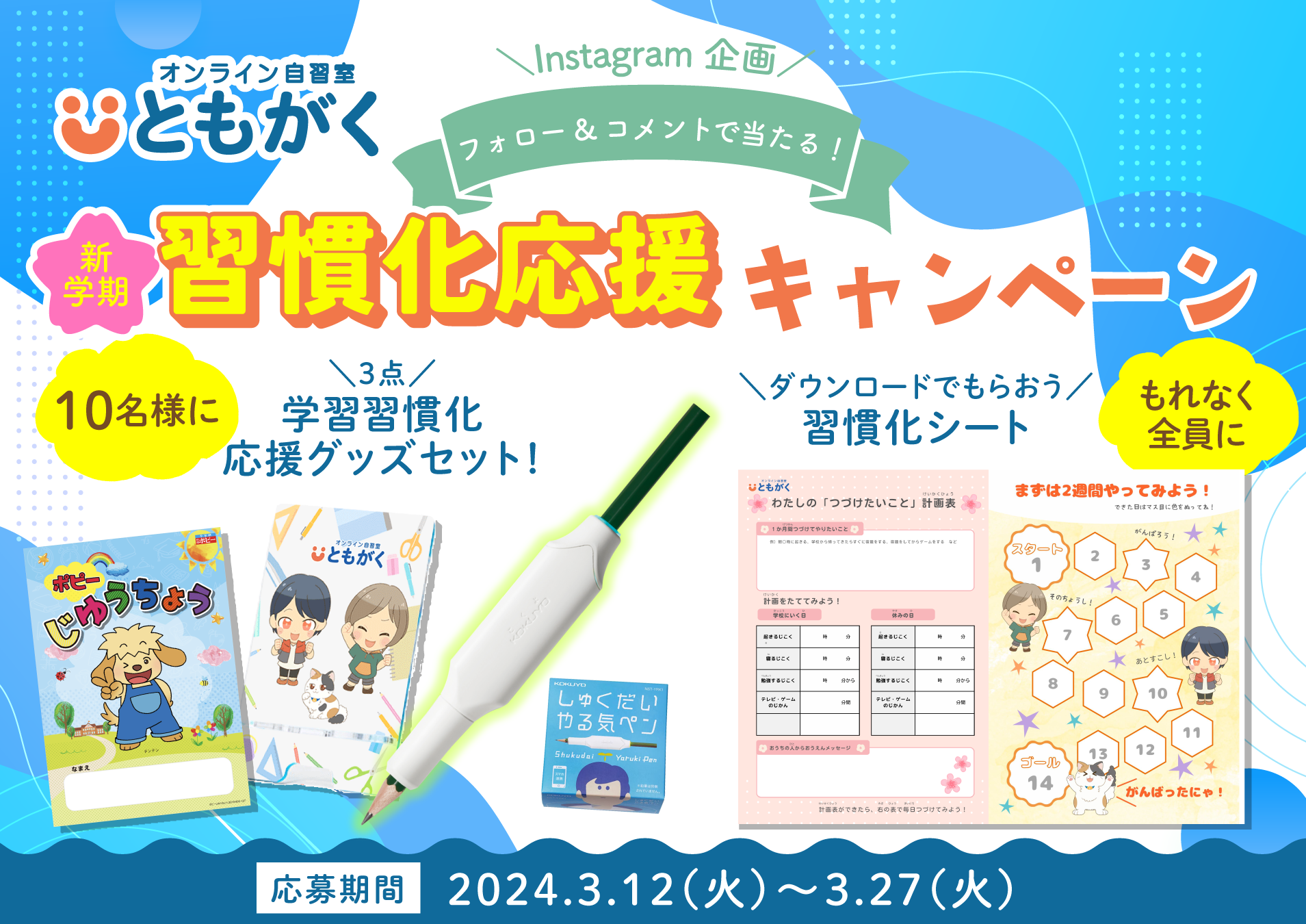 テーマは「習慣化」。ともがくでも、新学年になる4月からの家庭学習の「習慣化」をサポートしていきますが、学習習慣以外にも、生活の様々な場面で、習慣化が必要になってくることが、新学年の4月からは多く出てきます。よって、本キャンペーンでは、「生活習慣化・学習習慣化など、新学年で頑張って習慣化をめざすこと」をInstagramのコメントにて募集いたします。
