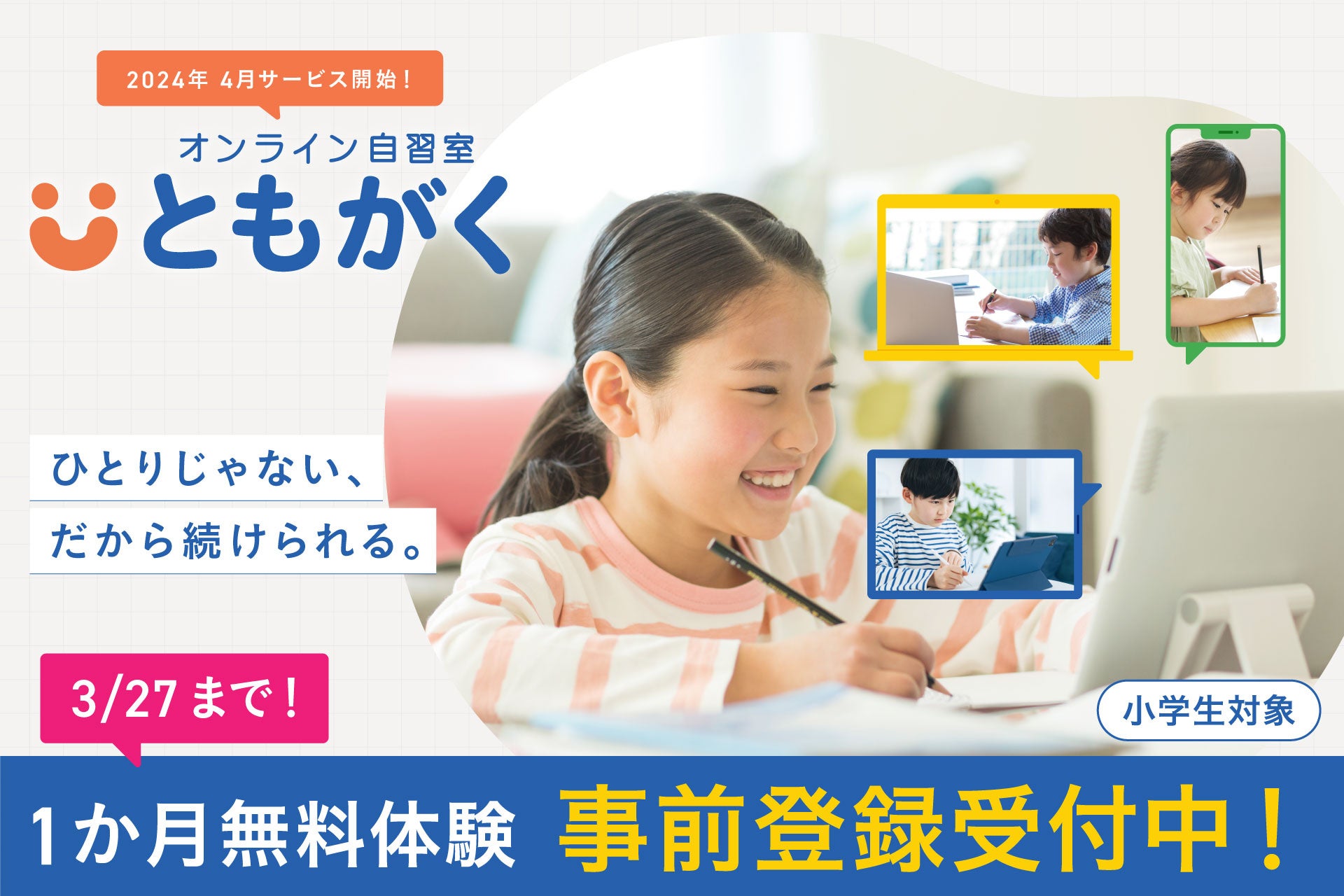 株式会社新学社(本社:京都市/代表取締役社長:山本 伸夫)は、2024年4月より小学生向けの新サービス「オンライン自習室『ともがく』」を提供いたします。ともがくは、塾や図書館での学習環境をご家庭で再現するオンライン自習室です。毎日同じ時間に、いつもの仲間と“ともに学ぶ”ことで、お子さまのやる気を引き出し、毎日の学習「習慣化」を実現します。
