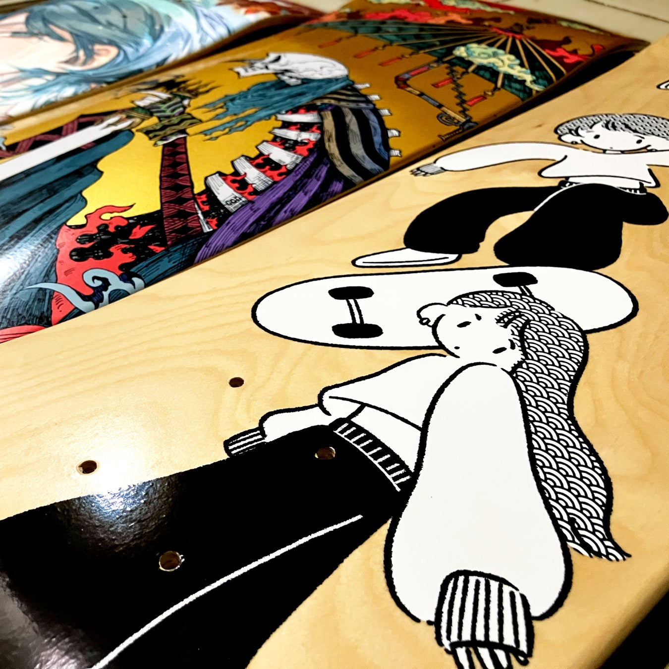 国内唯一のスケートボード専用プリント工場として、1枚からの受注やアーティストコラボレーションを展開。高解像度のインクジェットとシルクスクリーンを融合した印刷技術により、“滑る楽しさ、飾る美しさ”をコンセプトに、新しいスケートボードカルチャーを創造しています。