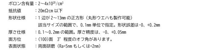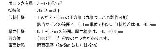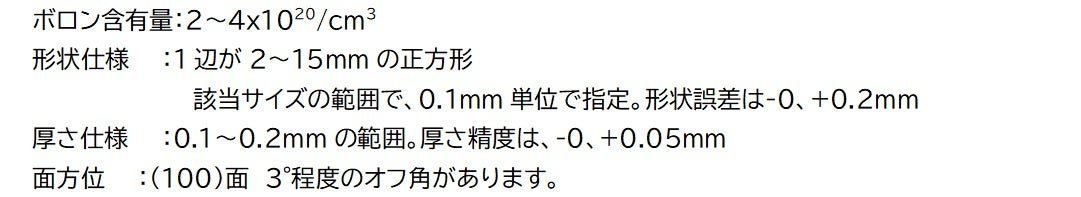 昨年8月に発売しました低抵抗基板は、7x7mm以下のサイズに限定されていました。このことによって、製作できるデバイスのサイズが小さいか、小型のデバイスでも多数個を同時に製作することは出来ませんでした。今回の新しい商品によって、大型デバイスの試作やその評価を進めることができるようになると考えられます。
