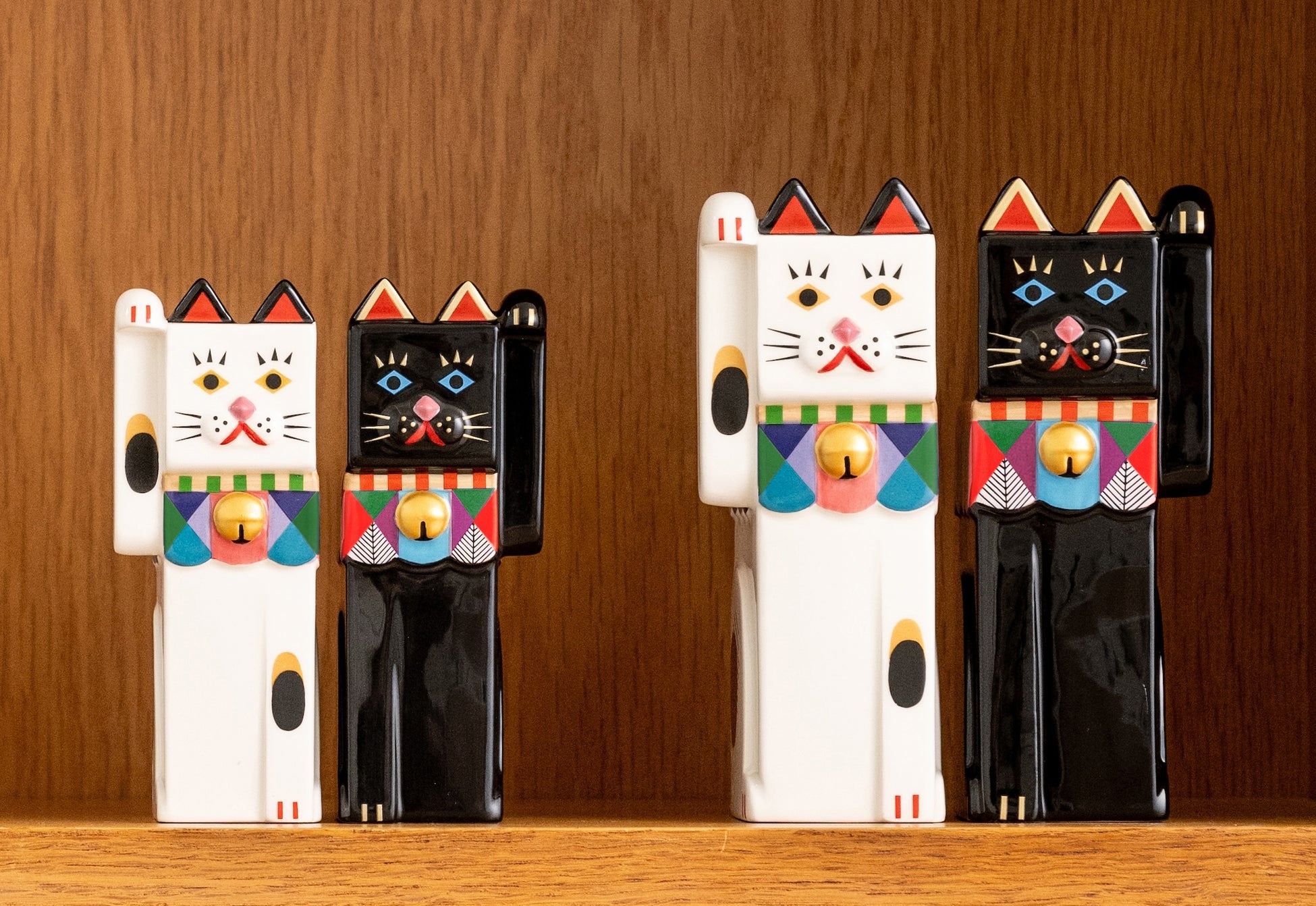 そしてついに、コラボレーションの第二弾として、瀬戸の招き猫に挑戦することになりました。 招き猫ミュージアムを訪れて『古瀬戸型招き猫』を見た時、凛々しい顔つきとすらりとした猫背の姿がカッコ いいなと思い、今回はその特徴を活かして、より形をシャープにデザインしています。背中のラインや腕の付け方など、何度もやりとりを重ねました。 右手をあげている猫と左手をあげている猫の2匹を並べると、ぴたっと寄り添うのが特徴です。 『あなたの毎日にそっと寄り添って、福を招いてくれますように。』という願いを込めています。