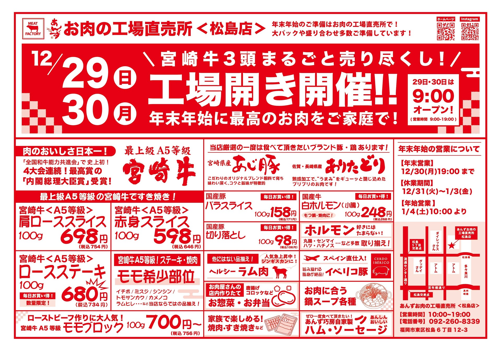 年末の“工場開き” では、年末年始のお集まりの席で、皆様に美味しいお肉をお楽しみ頂けるよう、多数のすき焼き・しゃぶしゃぶ・焼肉用肉や盛り合わせ商品・ブロック肉のA5等級宮崎牛を始め、あんずが全国から選び抜いた銘柄豚、お正月用鶏肉やスペイン産イベリコ豚、ジンギスカン用ラムまで肉のテーマパークが1年間の感謝を込めて売り尽くします!
