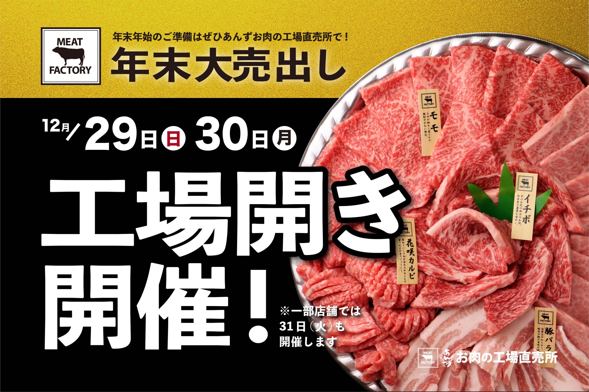 12月29日(日)・30日(月)の2日間で宮崎牛を3頭以上まるごと売り尽くす“工場開き” を開催いたします。(※一部店舗では31日も実施致します)