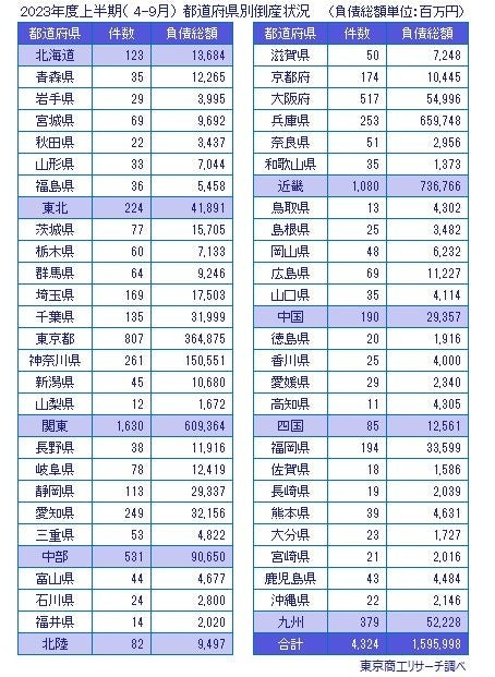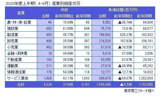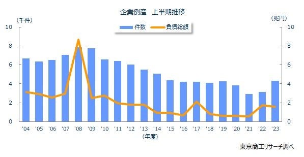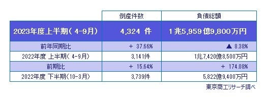2023年度上半期(4-9月)の全国企業倒産(負債額1,000万円以上)は、件数が4,324件(前年同期比37.6%増)、負債総額は1兆5,959億9,800万円(同8.3%減)だった。