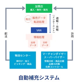 そこで、当社では、全国1,000店舗を超える導入店の毎日の販売POSデータをもとに、販売・在庫情報をリアルタイムに収集・分析し、週単位で在庫量をコントロールしています。季節・生活催事などのライフサイクル、市場動向や消費者ニーズにあわせて、商品を適時・適量な品揃えで補充していくシステムです。