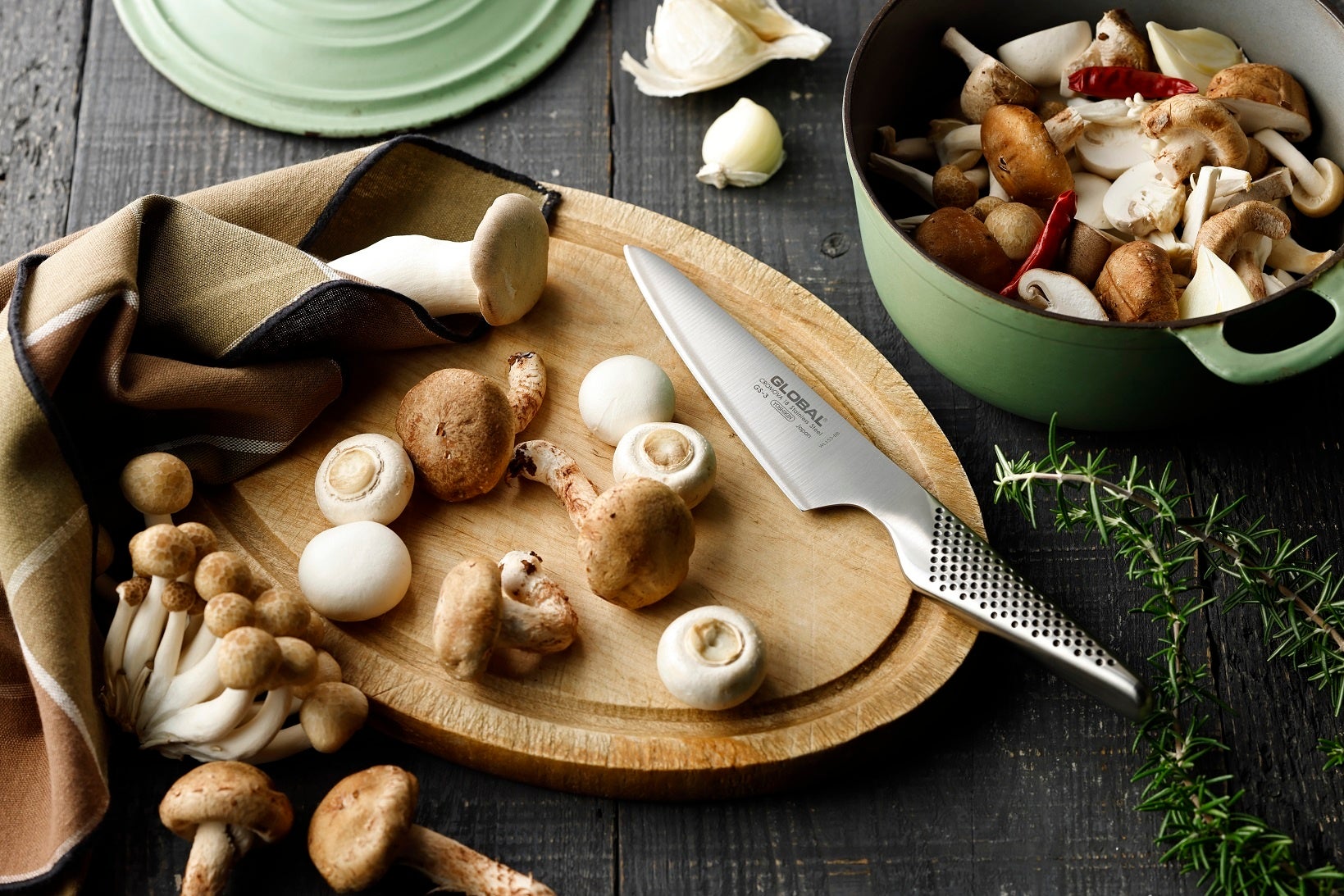 GS-3 ペティーナイフ13cmはGLOBALのアイコン的存在として GLOBAL誕生当時から多くのお客様に愛用され続けています。握りやすい形状のハンドルで、食材を手に持って皮をむくなどの使い方はもちろんのこと、細身ながらも刃元は刀幅があるので、まな板の上でも使いやすい包丁です。