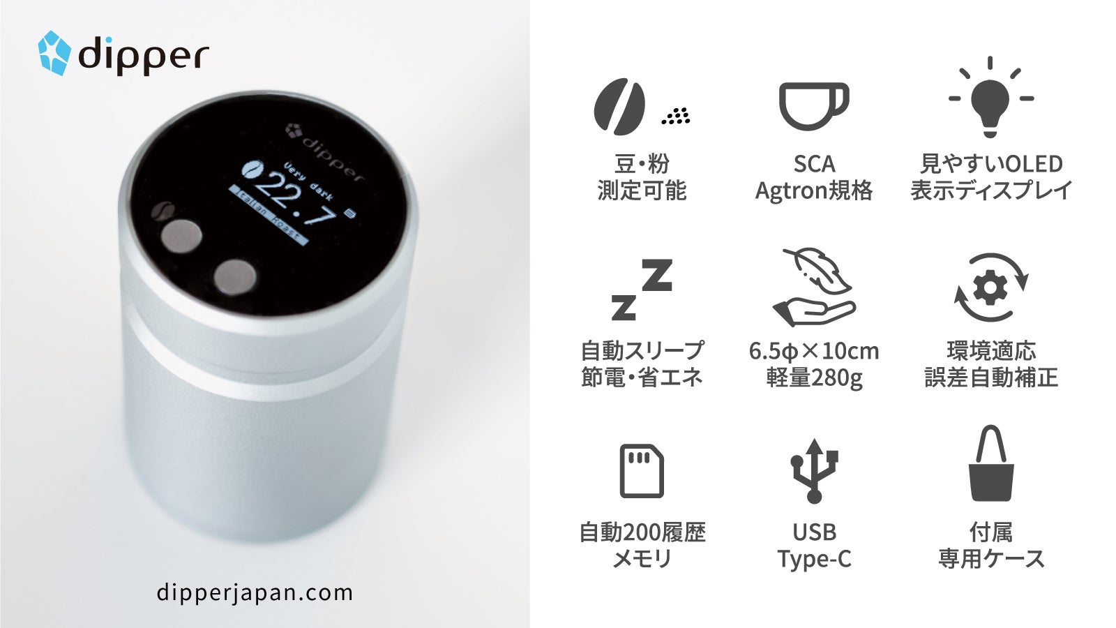 市場やお店で見かける焙煎度判定も、自己判定による曖昧なものではなく数値化できる世の中にしたい。このような様々な要望が背景にあり、誕生したのが、dipperです。