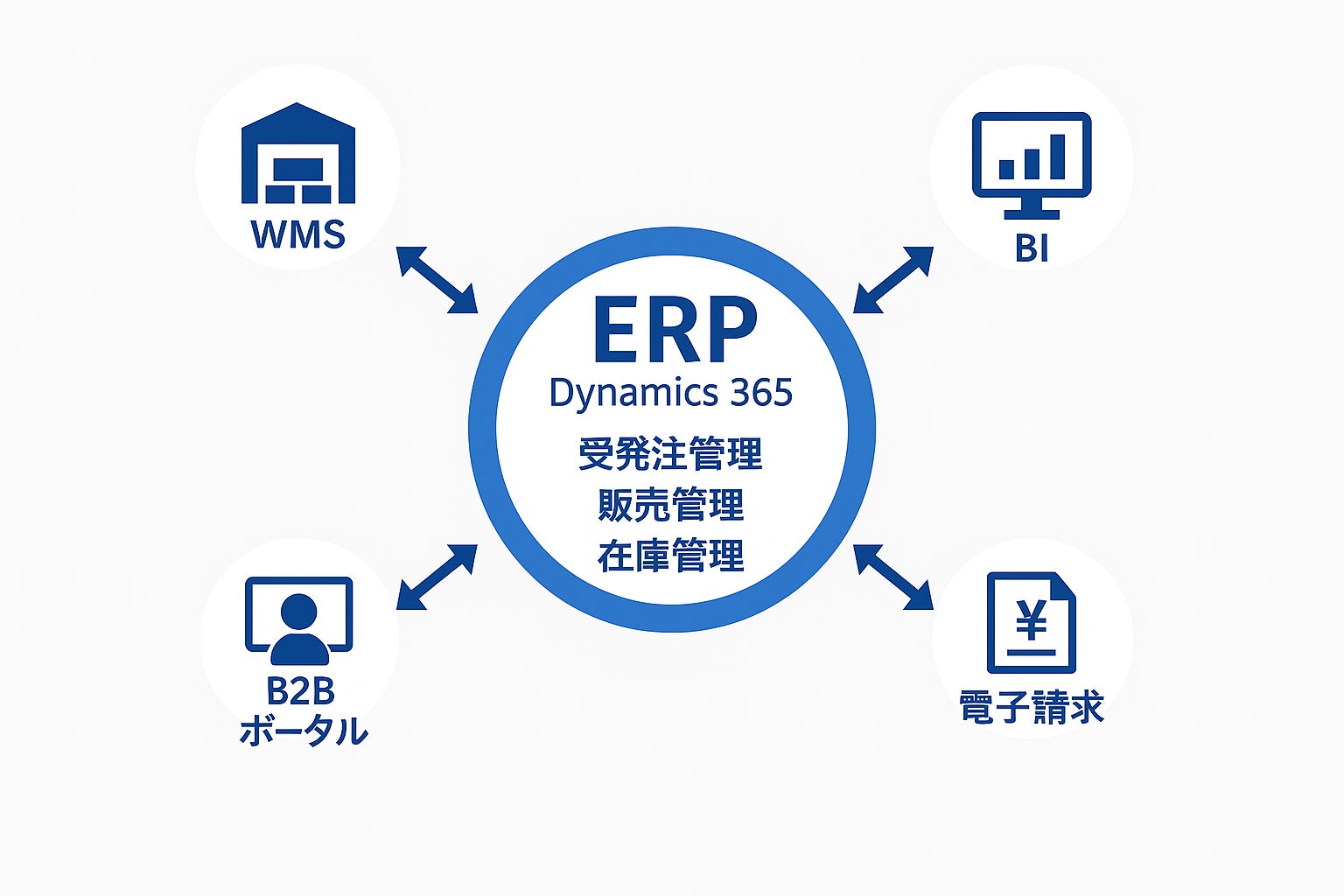 本サービスは、Dynamics 365やOracle NetSuiteなどのクラウドERPの業務基盤を中心に物流管理システム(WMS)やBIツール、電子請求システム、取引先ポータルなど既存システムとの連携を通じて、リアルタイムでのデータ統合・業務効率化・経営判断スピードの向上を実現します。