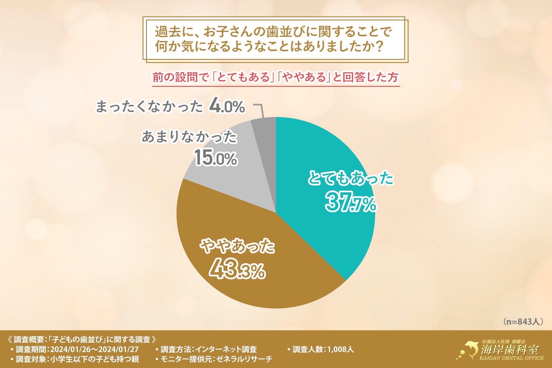 「過去に、お子さんの歯並びに関することで何か気になるようなことはありましたか?」と質問したところ、『とてもあった(37.7%)』『ややあった(43.3%)』『あまりなかった(15.0%)』『まったくなかった(4.0%)』という回答結果になりました。