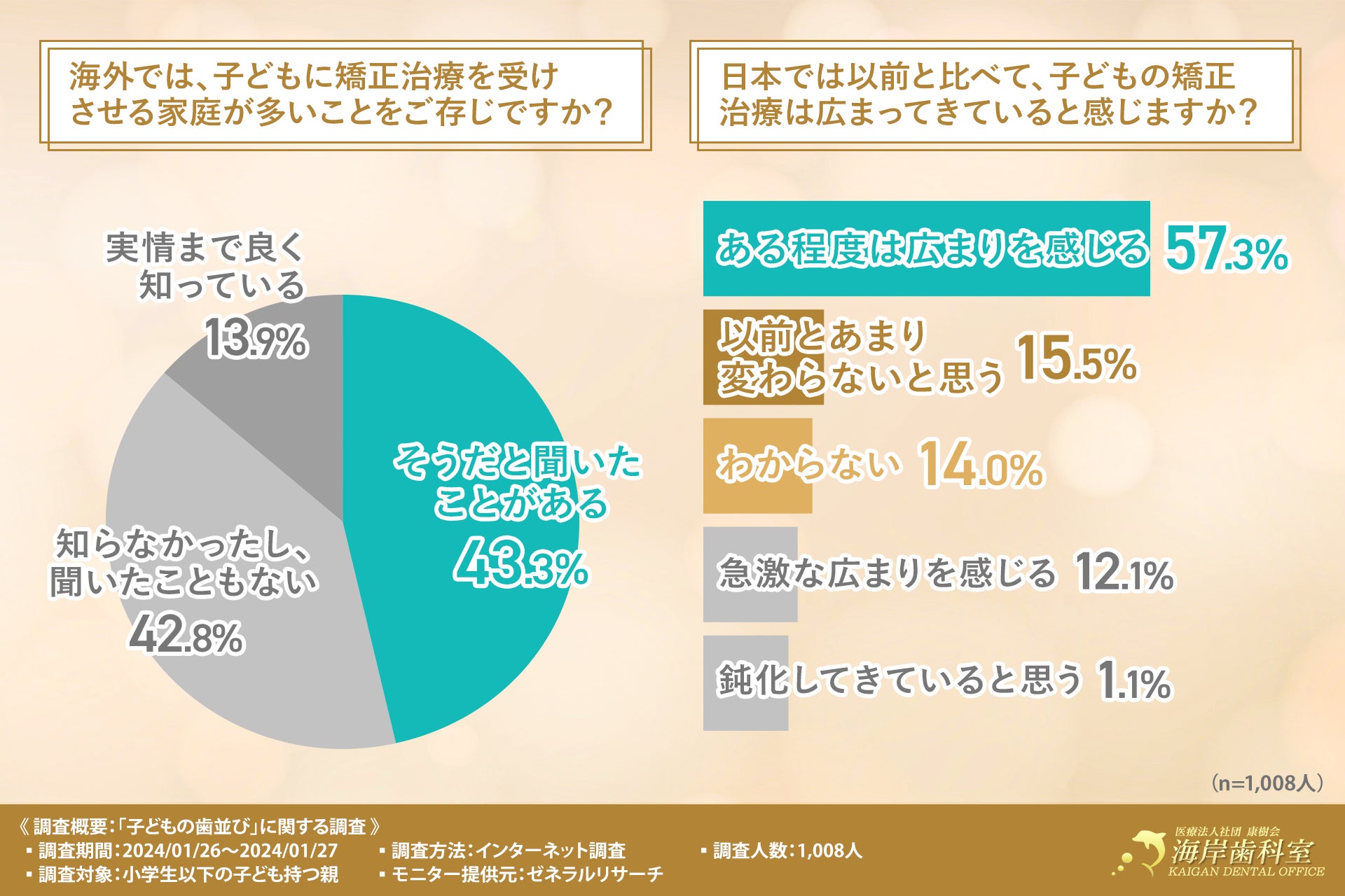 はじめに、「海外では、子どもに矯正治療を受けさせる家庭が多いことをご存じですか?」と質問したところ、『そうだと聞いたことがある(43.3%)』『知らなかったし、聞いたこともない(42.8%)』『実情まで良く知っている(13.9%)』という回答結果になりました。