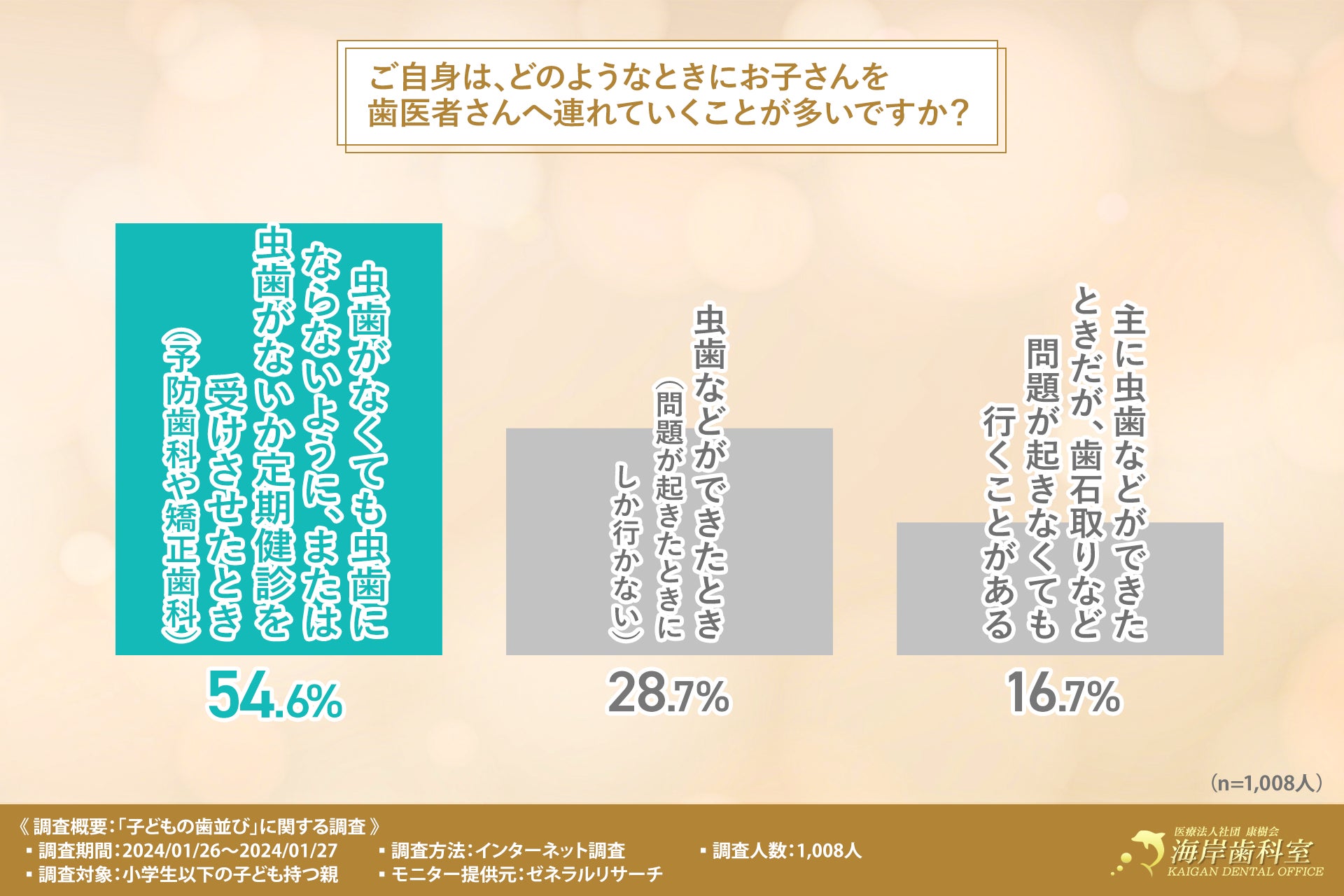 次に、「ご自身は、どのようなときにお子さんを歯医者さんへ連れていくことが多いですか?」と質問したところ、『虫歯がなくても虫歯にならないように、または虫歯がないか定期健診を受けさせたとき(予防歯科や矯正歯科)(54.6%)』が最も多いという回答結果になりました。