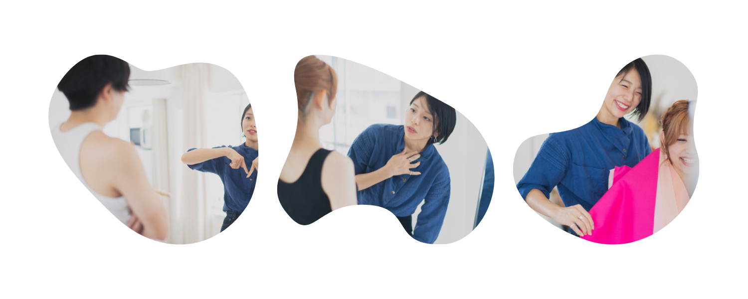 サロン内のフィッティングルームにて、骨格・パーソナルカラーの診断を行う専門家2人が、お客様のタイプを診断します。その後、本当に似合うアイテムとスタイリングをその場でご提案。今後の洋服選びにも役立つようポイントをお伝えしながら、サポートしていきます。また、クローゼットに眠る服を1着お持ちいただくと、ご自身に似合うコーディネートをご提案します。