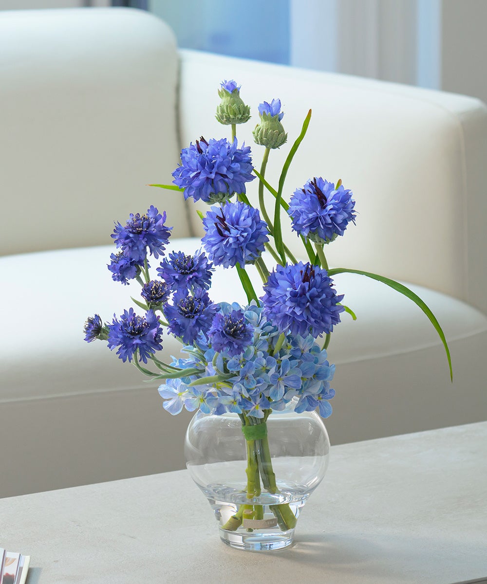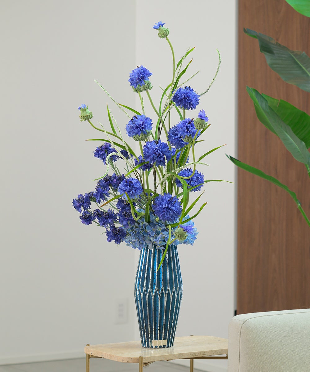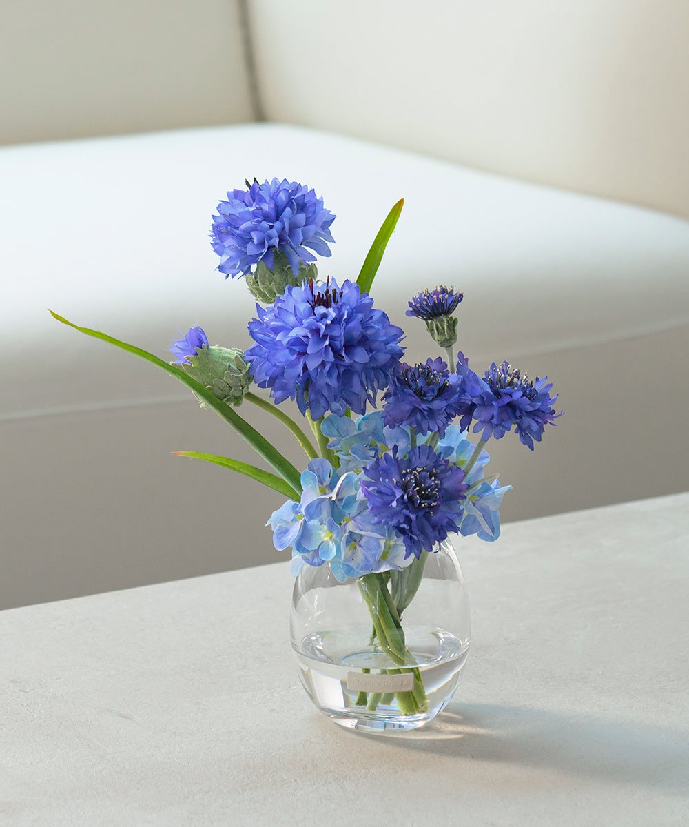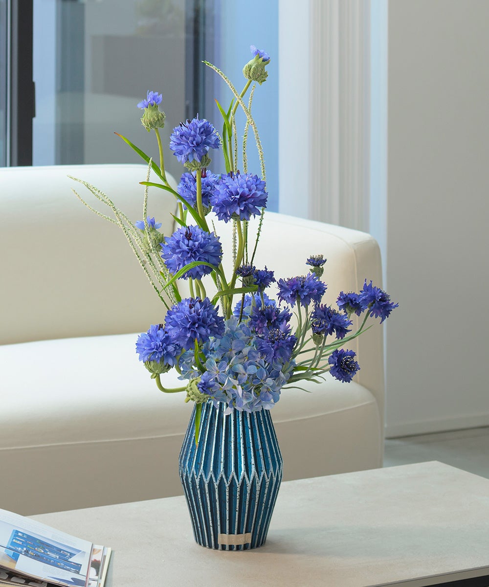 フランスの国花でもあるコーンフラワーはエミリオ・ロバで大人気のフラワーデザインです。風に棚引くリズミカルな動きと繊細で可憐な表情のコーンフラワーが瑞々しく寄り添いあい、リーフの先端まで生命力を感じる躍動感のあるデザインに仕上げています。都会的な雰囲気を醸し出すクールなジオメトリック花器は、シンプルながらも洗練されたデザインで、インテリアにモダンなアクセントを与えます。