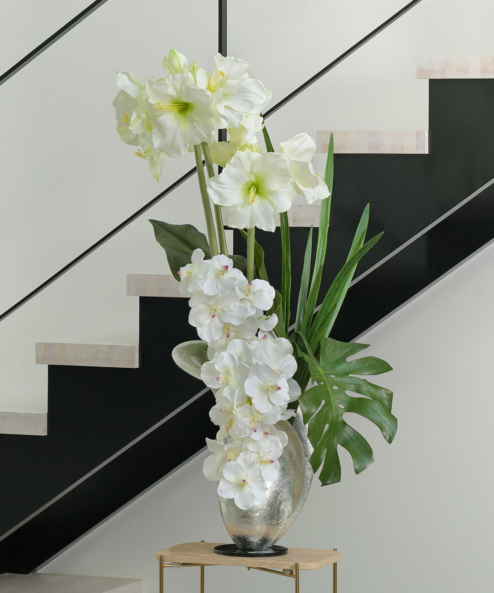 アマリリスの直線的でダイナミックなデザインに、バンダとリーフの曲線が躍動感を与える生命力溢れる作品。ホワイトアマリリスをインテリアに取り入れることで空間に上品な響きを与え、清潔感と優雅さを感じることができます。同じ方向を向いて咲くことのないアマリリスの自然本来の姿をそのまま表現したエミリオ・ロバならではのデザインです。瑞々しいバンダを引き立てるユニークで上品な花器は、個性的なフォルムで描かれる造形美が特別な存在感を放ちます。