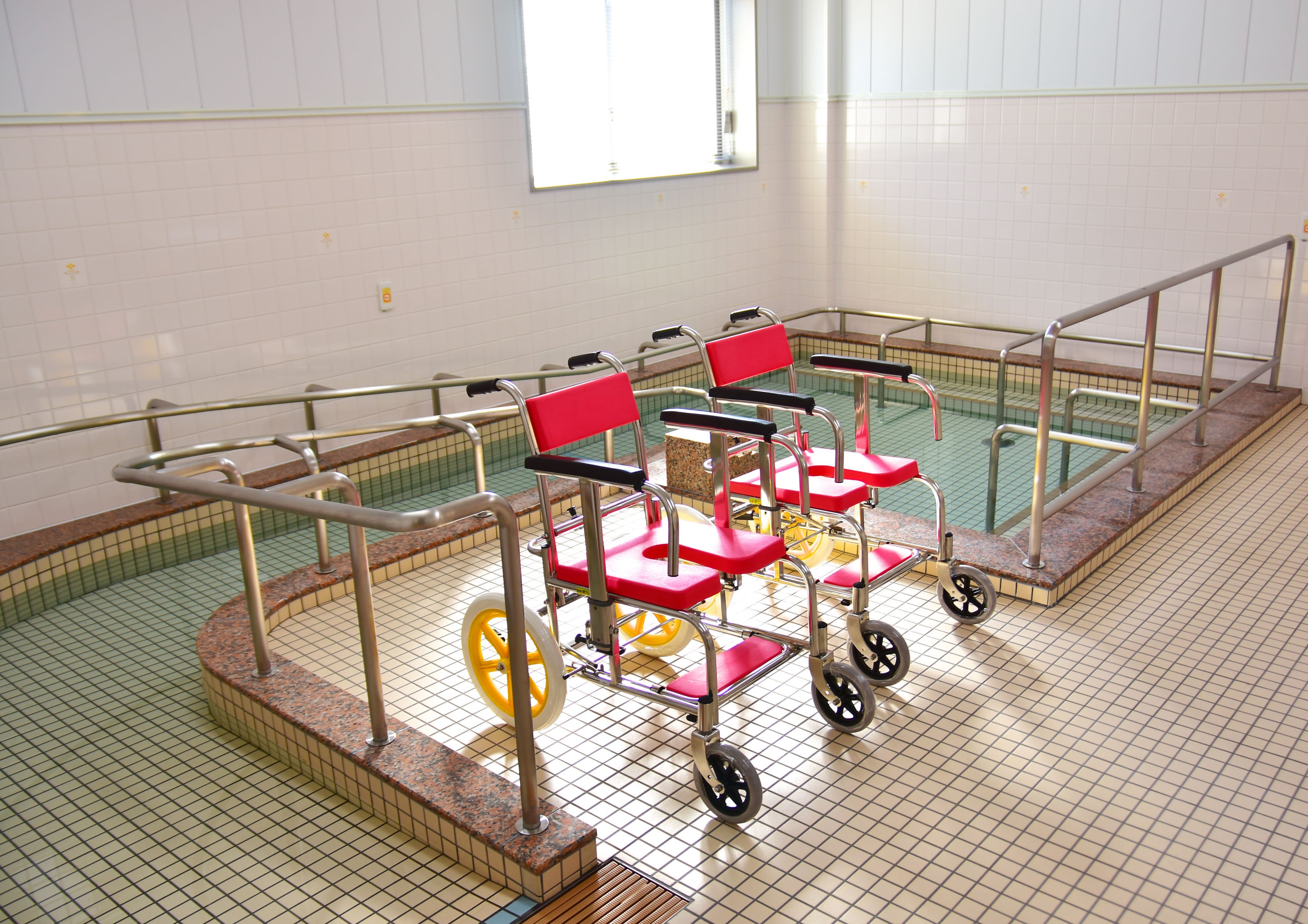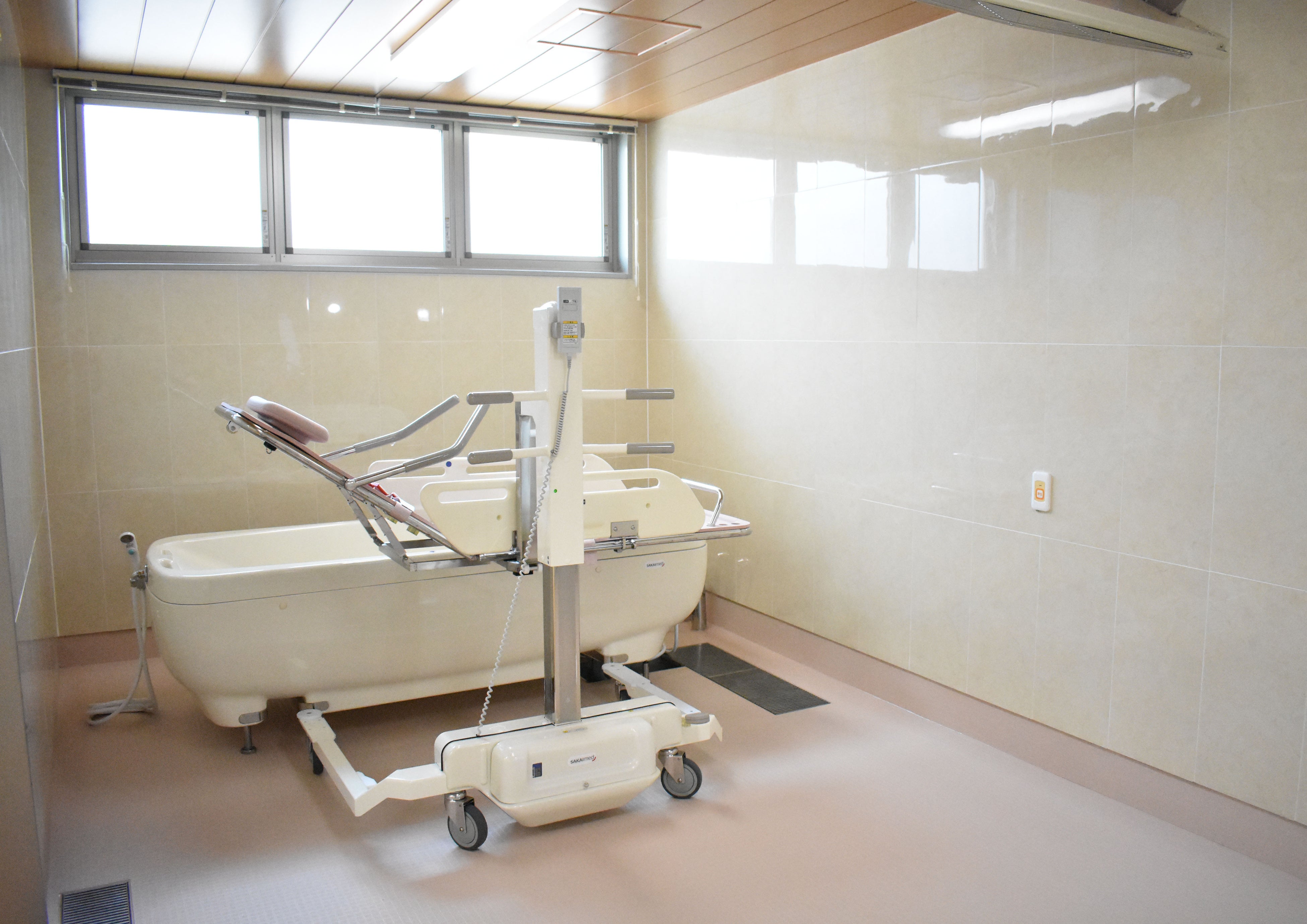 大浴場には浴室用車いすのまま浴槽に入れるようスロープを設置し、可能な限り大きなお風呂でゆったりと入浴していただけるよう工夫しています。もちろん、寝たきりの方など座位の保持が困難になられた方にも安心して入浴していただけるように機械浴槽もご用意しています。