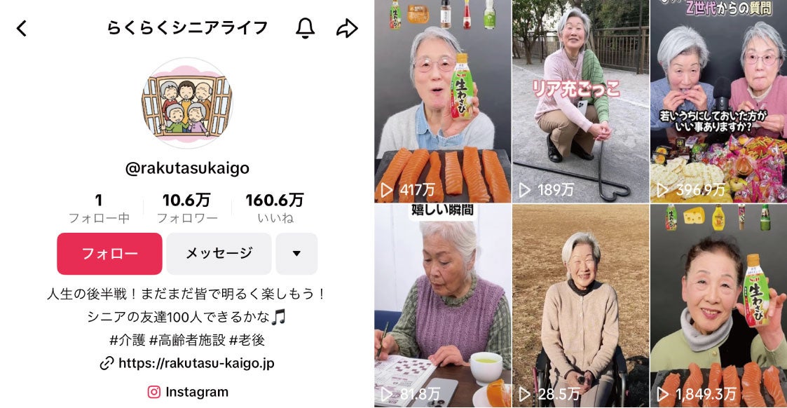 2023年のTikTok PR動画ランキングにおいて、Google 検索をPRした動画が1位を獲得した、株式会社M2DK(マツダ家の日常)(代表取締役社長:幸田晋)が、株式会社ラクタス(代表取締役:青木 圭太 所在地:北海道札幌市北区)のTikTokのアカウント「らくらくシニアライフ」( https://www.tiktok.com/@rakutasukaigo )をプロデュースし、特に人気の動画では1800万回再生を超える動画をリリースしています。(2024.03.02現在)