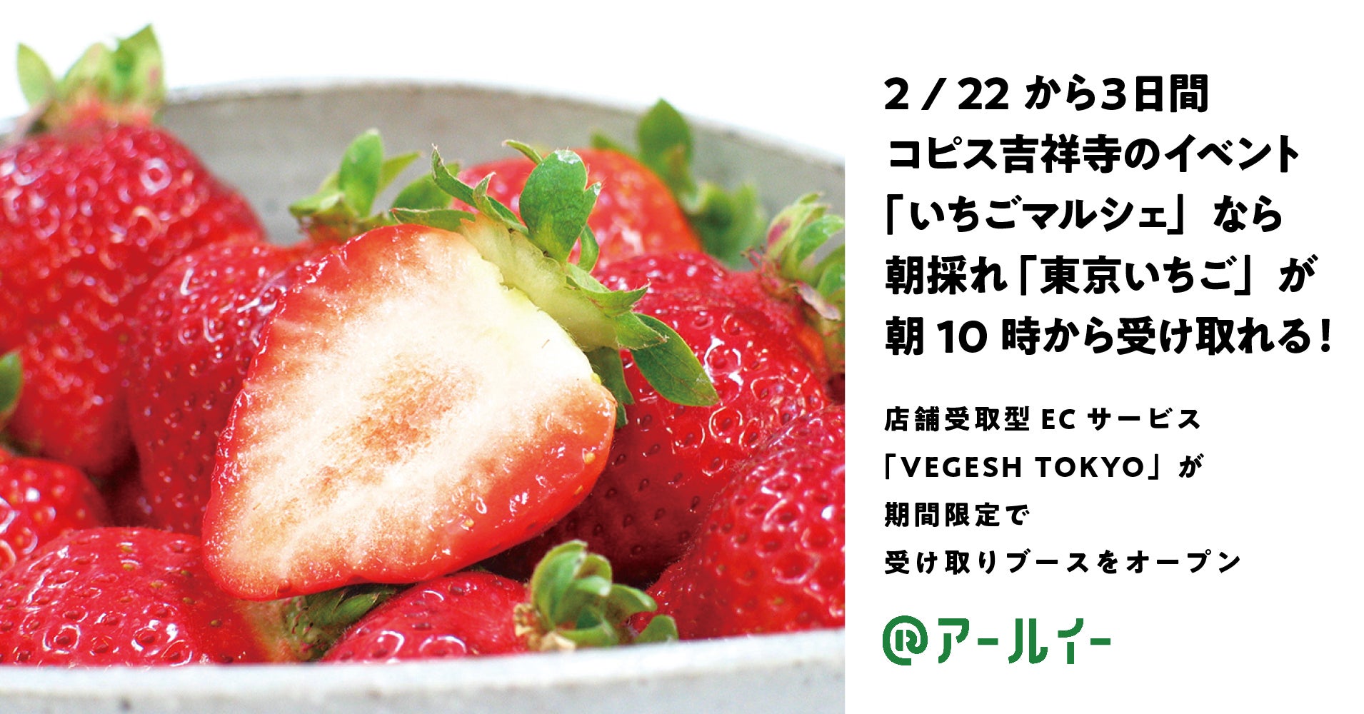朝採れの「東京いちご」が朝10時に受け取れる!都内の地産地消を促進する店舗受取型ECサービス「VEGESH TOKYO」が2/22から3日間「いちごマルシェ in コピス吉祥寺」に受取ブースをオープン