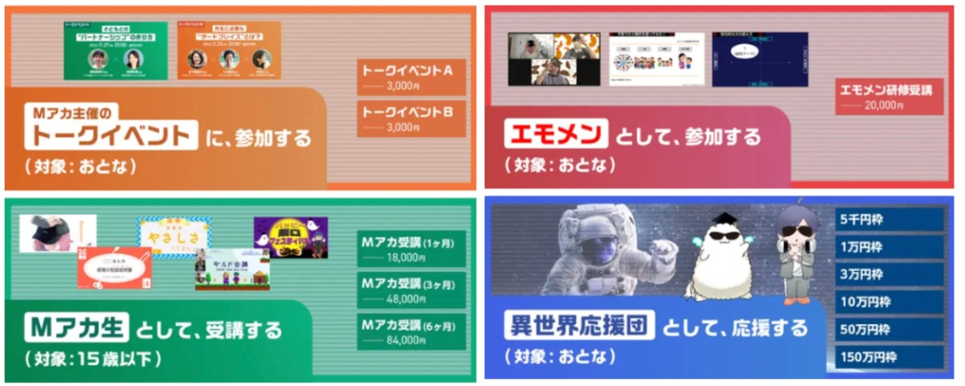 アニメーションやzoomを活用した対話からはじまり、他のMアカ生と集まって企画を作るギルド会議を通して、学校を作っていきます。また、エモメンターという感情の専門家が受講開始半年後に一人一人の子供に向けてトリセツを送ります。これらのことを通して、子供それぞれが興味あることや個性、才能をみつけることができます。