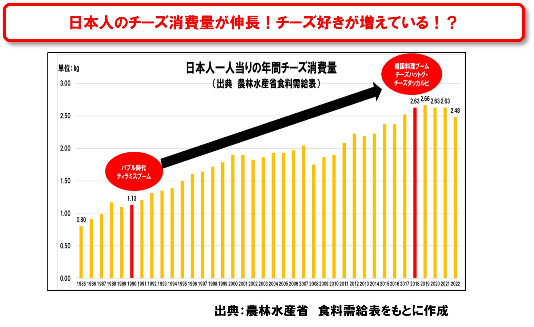 日本のチーズ消費量は30年で2.3倍以上に伸長しており、チーズ好きが増えていると考えられます。また、近年の韓国料理ブームでチーズをふんだんに使ったメニューが若年層を中心に大ヒットしたことで、韓国料理以外でもチーズ特盛メニューが拡大しています。通常のチーズ量より、もっと「チーズに満たされたい」ニーズが拡大していると考えられます。