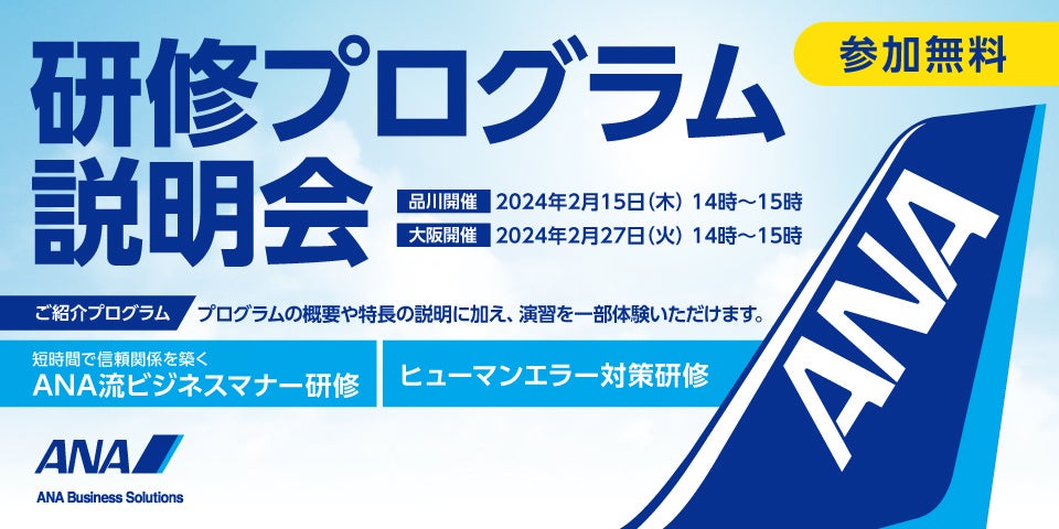 ANAビジネスソリューション株式会社(本社:東京都大田区/代表取締役社長:柴田 雄司)は、2024年2月に、東京<品川>と大阪<梅田>で「研修プログラム説明会」を開催します。