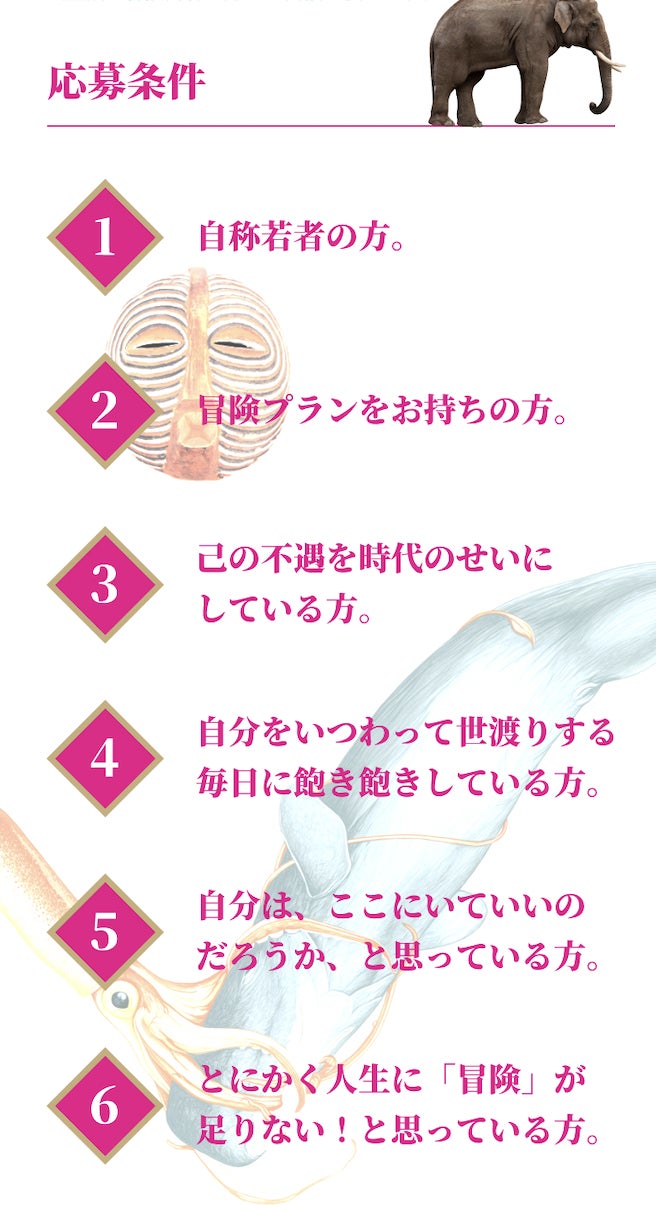 一人で世界に旅立ち、自由でなんでもできてしまう今回の冒険。だからこそ、「絶対にこれをやり遂げたいんだ!」というだれにも負けない信念が求められます。今回私たちが求めている人物像は6項目。“真の冒険者”を探しています。