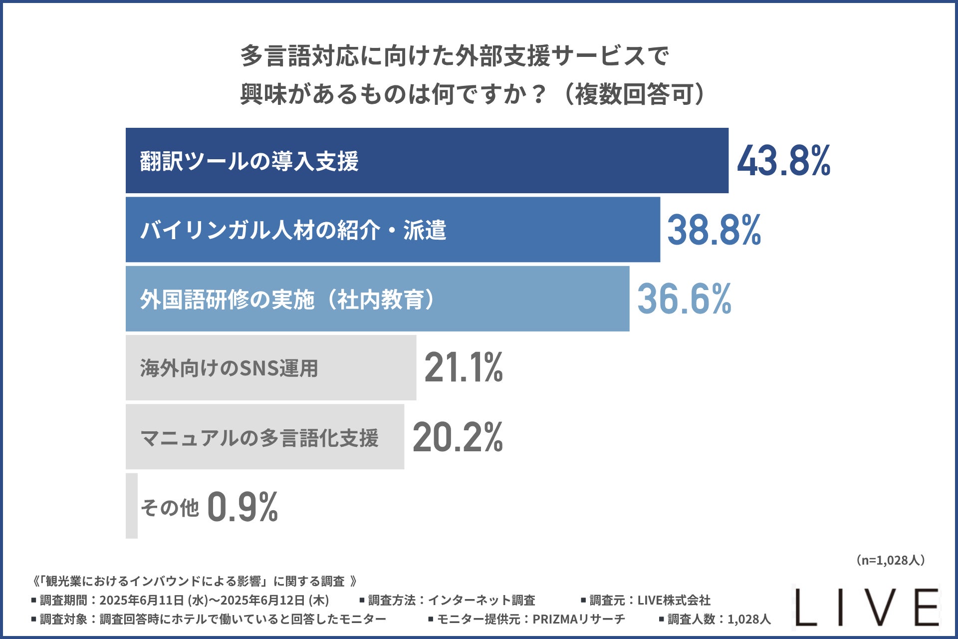 外部支援サービスへの関心も高く、即効性のある外部支援サービスの導入と中長期的な多言語対応人材の育成のバランスが、今後のホテルのインバウンド対応の鍵となるでしょう。