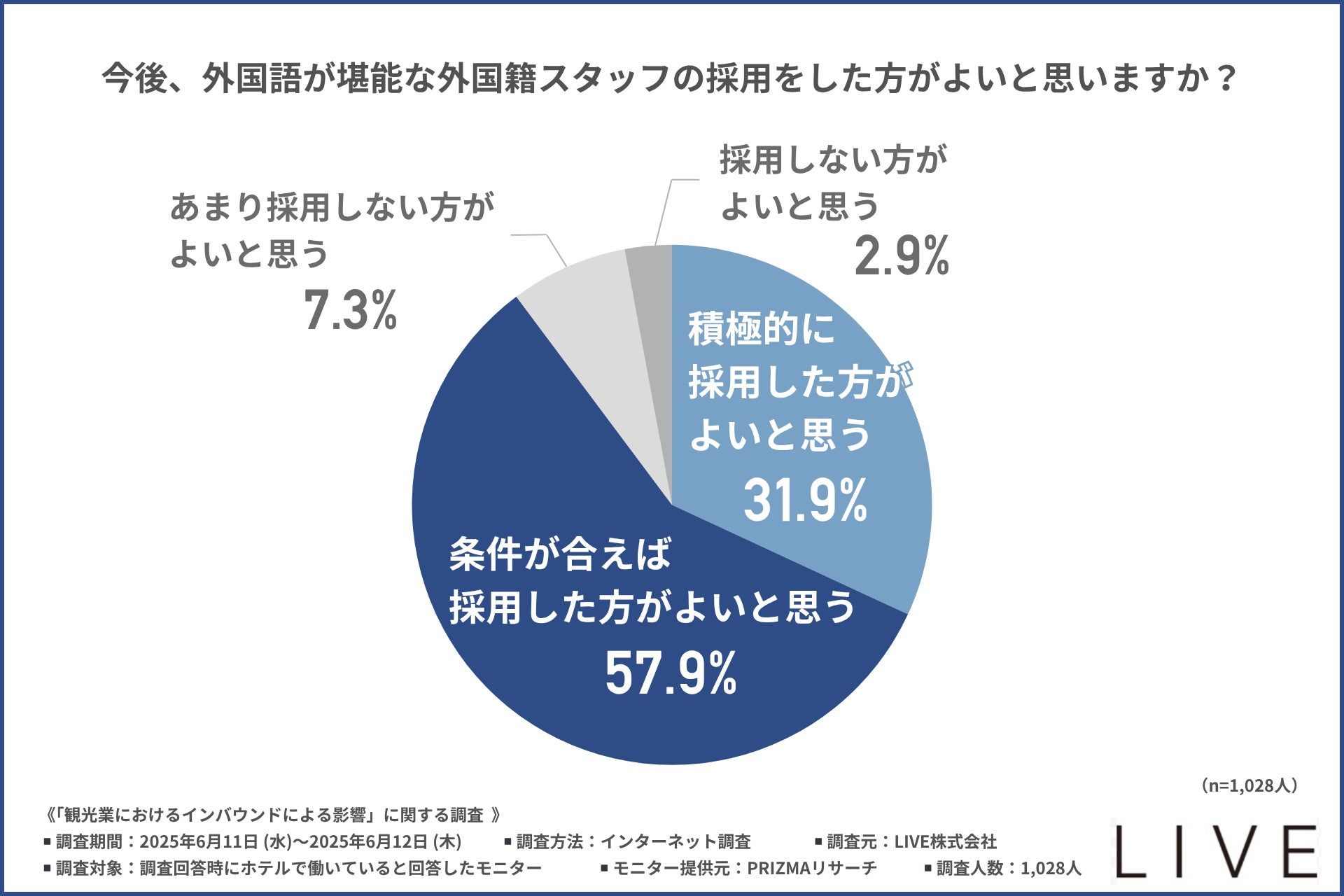 「今後、外国語が堪能な外国籍スタッフの採用をした方がよいと思うか」と尋ねたところ、約9割が『積極的に採用した方がよいと思う(31.9%)』『条件が合えば採用した方がよいと思う(57.9%)』と回答しました。