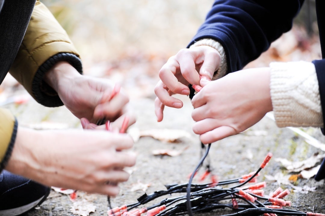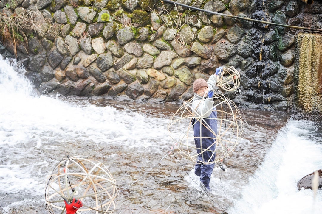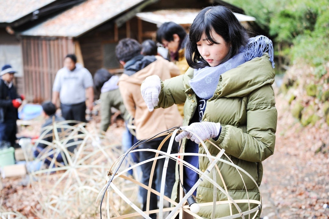 高さ2mほどの「筒灯籠」や、竹ひごを一本一本手作業で編み込んだ「毬灯籠(まりとうろう)」は、すべて旅館スタッフや地域住民の手作りです。機械生産ではない、人の手による「ゆらぎ」のある灯りが、冬の凛とした空気の中で見る人の心を温めます。