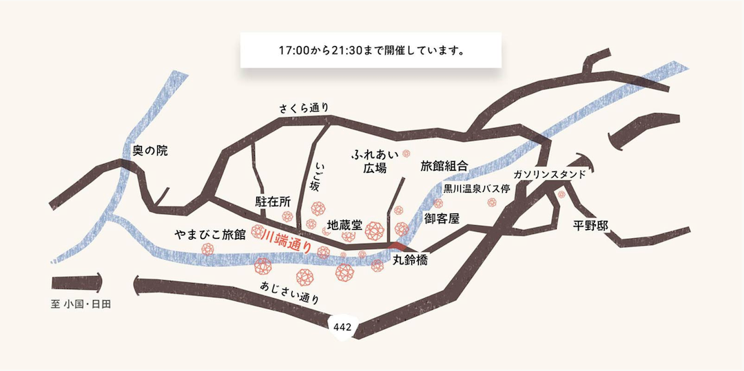 開催場所: 黒川温泉(丸鈴橋~川端通り、やまびこ旅館付近、べっちん館、黒川温泉バス停)