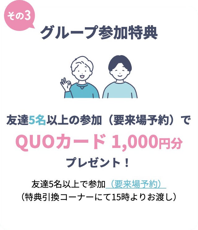 友達5名以上の参加(要来場予約)でQUOカード1,000円プレゼント!