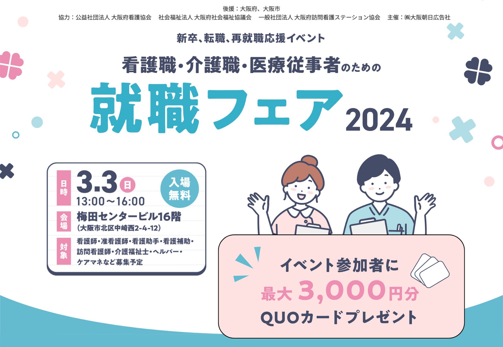 【QUOカード最大3000円分もらえる】「看護職・介護職・医療従事者のための就職フェア」を梅田センタービルにて3月3日(日)に開催
