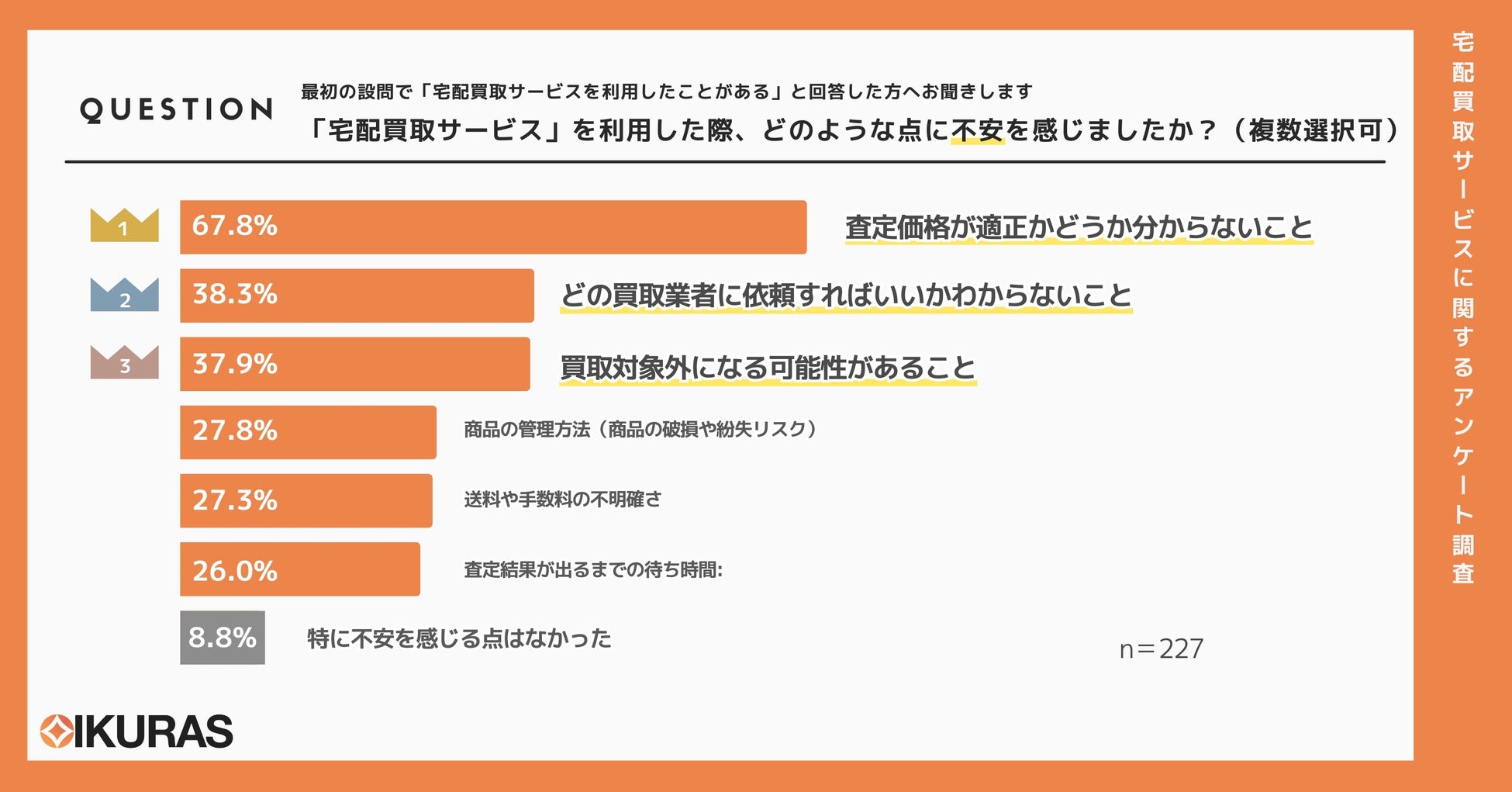 次に、宅配買取サービスの利用に関する不安要素を明らかにするため、先の設問で宅配買取サービスを利用したことのある227名を対象に、「宅配買取サービスを利用した際にどのような点に不安を感じたか」というアンケート調査を実施しました。