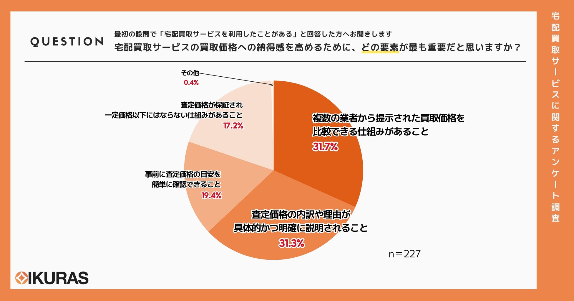 この結果から、利用者が納得して宅配買取サービスを利用するためには、単に価格を提示するだけでなく、その根拠や比較材料をしっかりと提示することが求められていると言えます。特に、複数業者の見積もりを比較できる仕組みや、査定理由の説明を強化することが、利用者の信頼を高めるための重要なポイントであることが浮き彫りになりました。