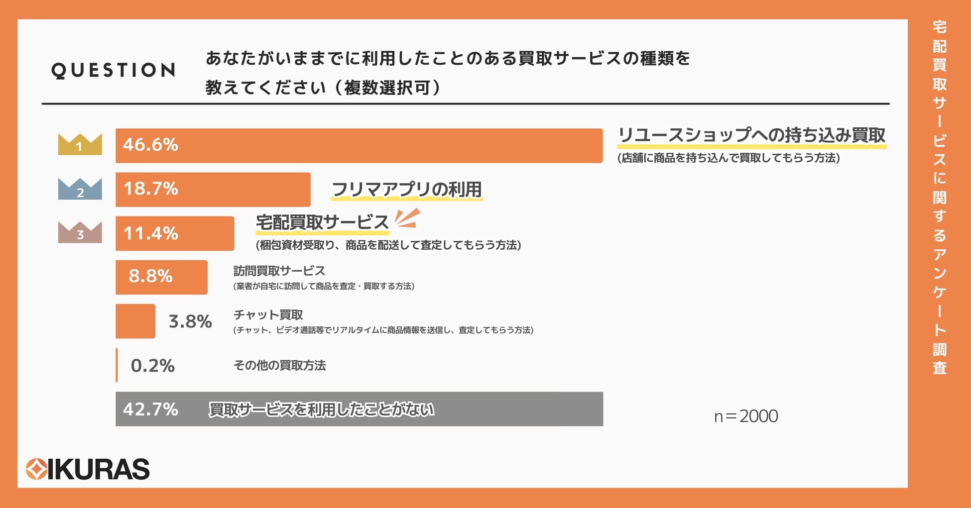 まず始めに、全国の男女2000名を対象にどのような買取サービスを利用したことがあるのかを把握するための調査を実施しました。その結果、最も利用経験が多い買取方法は「リユースショップへの持ち込み買取」で、46.6%が利用経験ありと回答しました。