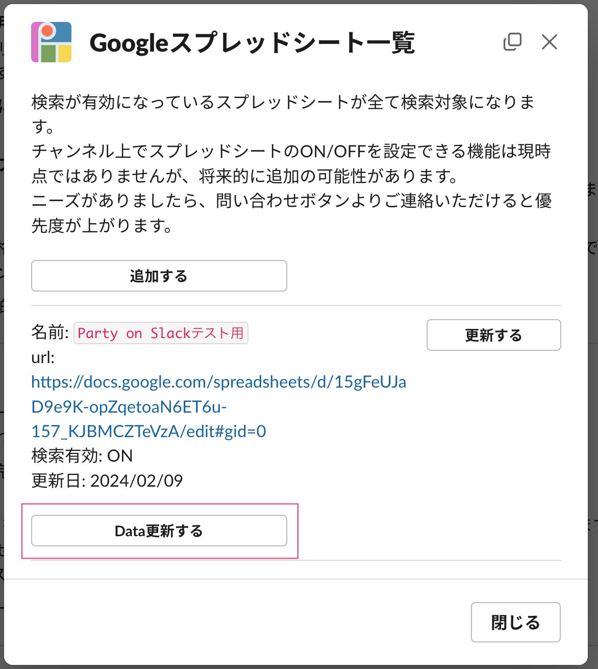 スプレッドシートの情報を更新した場合は、Party on Slackのデータ更新ボタンを押すことで、登録情報が一括で更新されます。
