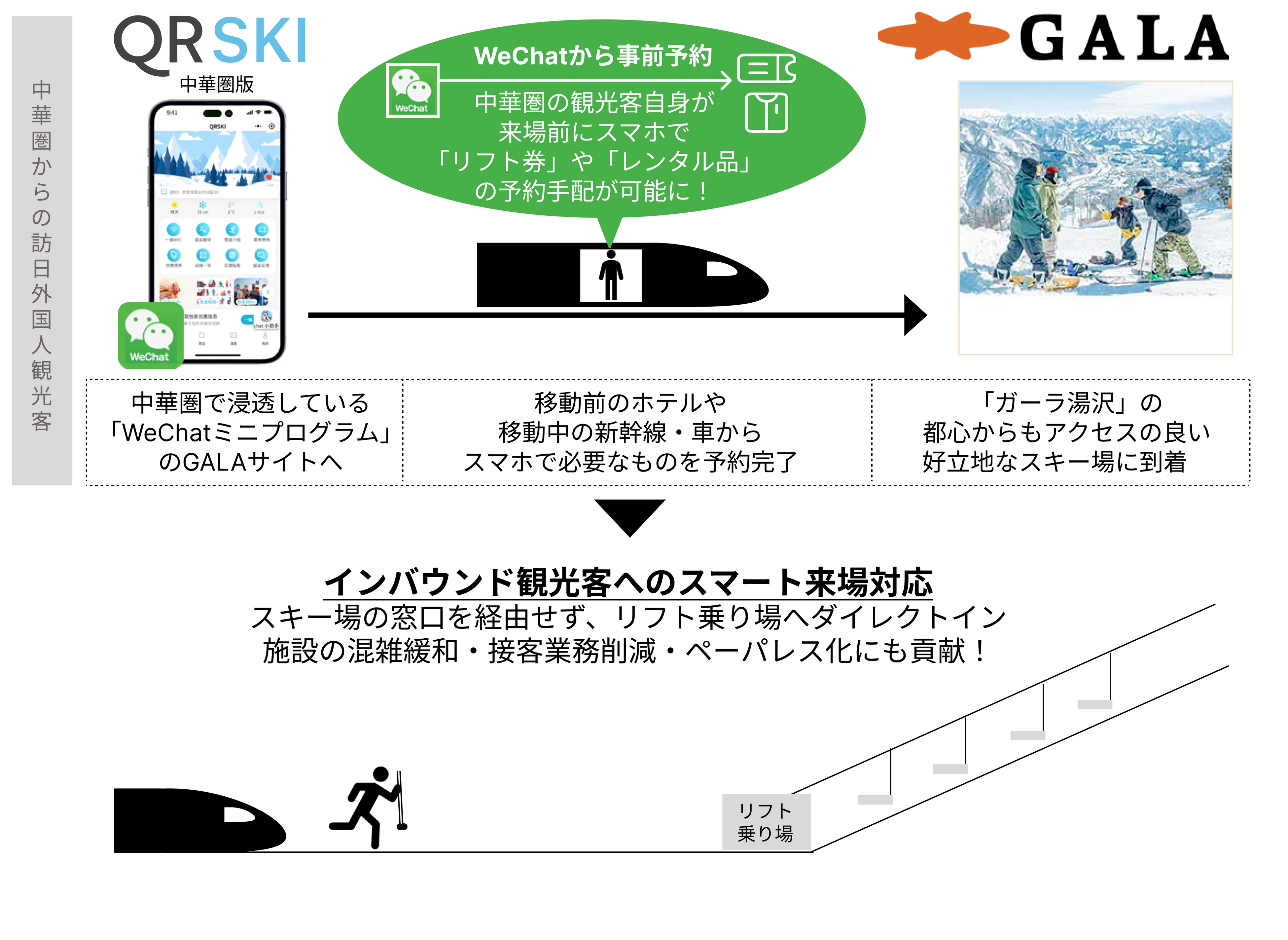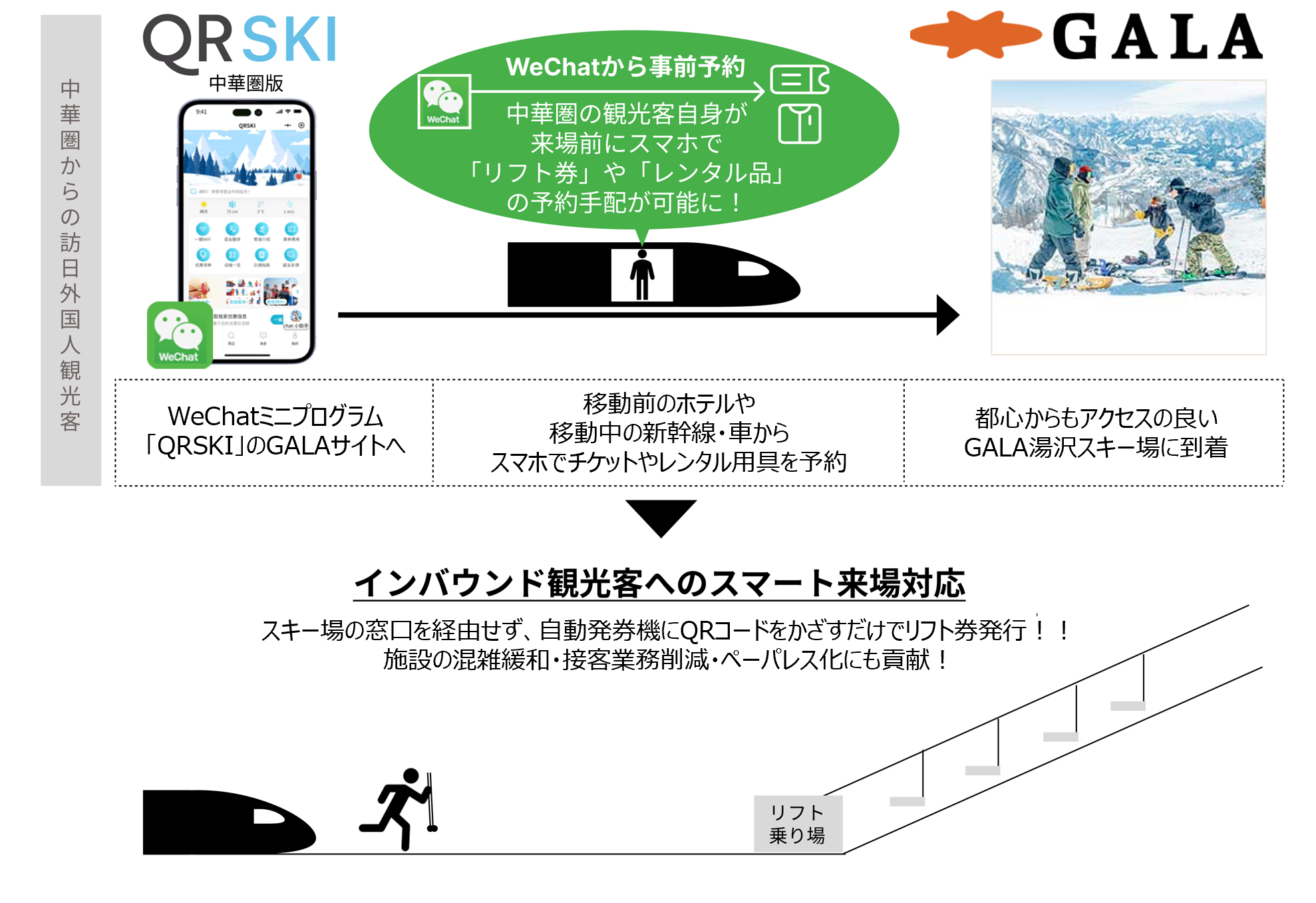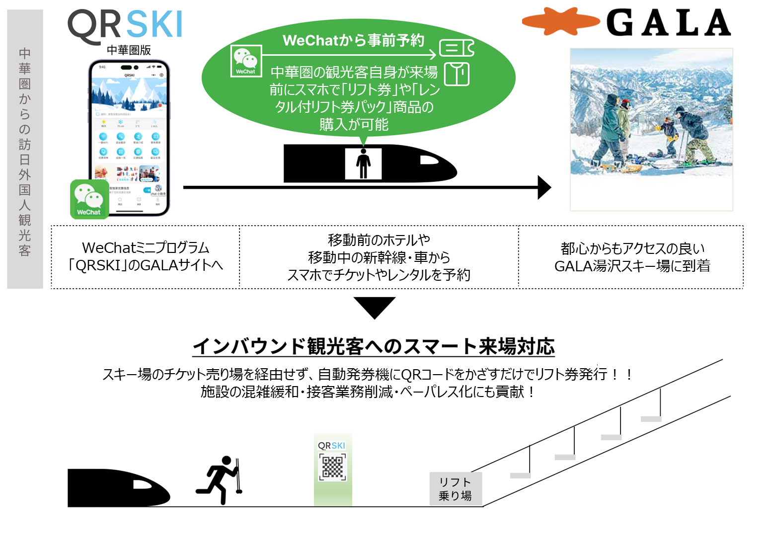 この度、JR東日本グループの「GALA湯沢スキー場(新潟県)」が推進するインバウンド観光客のスマート来場・接客強化施策の一環として、スマートコンシェルジュサービス「QRSKI(中華圏版)」を導入していただきます。。本取り組みの目的であるテクノロジーを活用した来場者の混雑緩和と顧客満足度向上を両立する新たな付加価値創出を目指していきます。