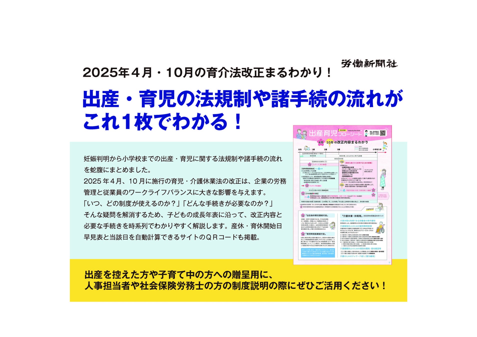 株式会社労働新聞社(本社:東京都板橋区、代表取締役社長:森川泰孔)は、2025年6月10日(火)に『出産 育児 フローシート(2025年版)』(発行元:(株)トータル人事システム、監修:労働新聞社、編集:SI-MooT)を刊行しました。
