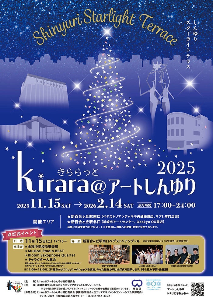 イルミネーションイベント「kirara@アートしんゆり2025」小田急線新百合ヶ丘駅の冬の風物詩・11月15日(土)はステージ&パフォーマンスショーによるクリスマス点灯イベント開催!