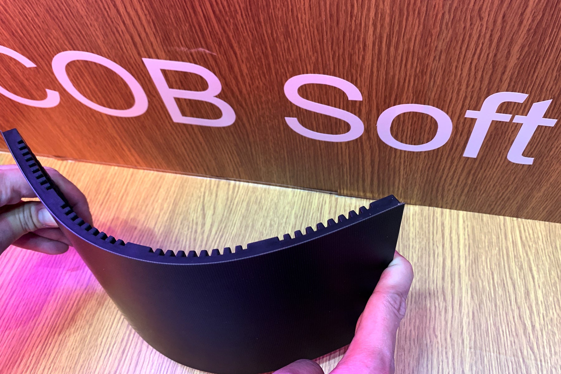 また、従来のLEDビジョンと比べて1/50サイズのマイクロLEDチップを採用したモデルや、フレキシブル加工が可能なCOBタイプのソフトモジュールも紹介。来場者は、実際に製品に触れ、その高精細な映像を間近で体験することができました。