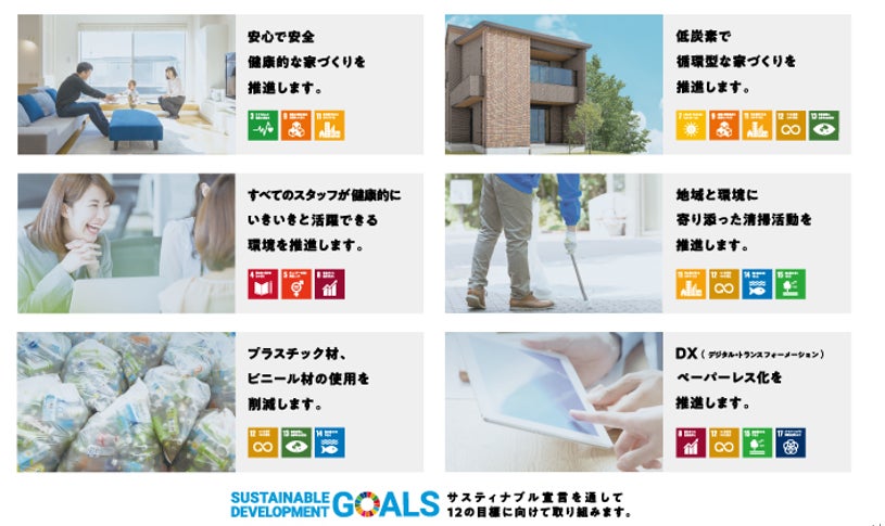 ウィザースホームでは、ご家族との家づくり・暮らしづくりを通して、地球の未来を考え、行動していきます。 国連が提唱するSDGs17の目標の内、No.3、No.4、No.5、No.7、No.8、No.9、No.11、No.12、No.13、No.14、No.15、No.17の12の目標に関する、6つのサスティナブル宣言を行い、事業を推進しています。高性能住宅の提供を通じて、「安心で安全、健康的な家づくりの推進」や「低炭素で循環型な家づくりの推進」の取り組みを実現していきます。