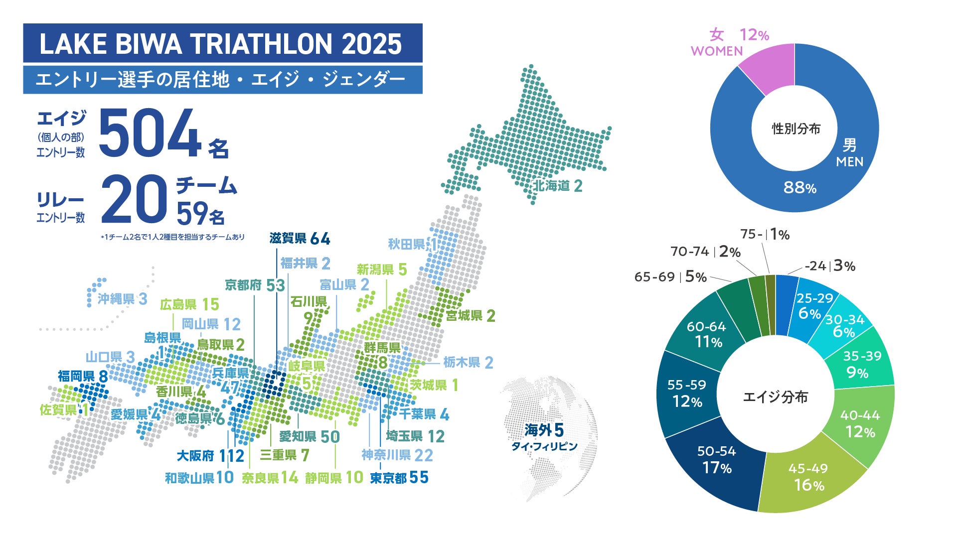 LAKE BIWA TRIATHLON 2025では、日本国内35の都道府県と、海外からも選手を迎え、個人504名、リレー20チーム・59名、総計563名の選手を迎えて開催します。