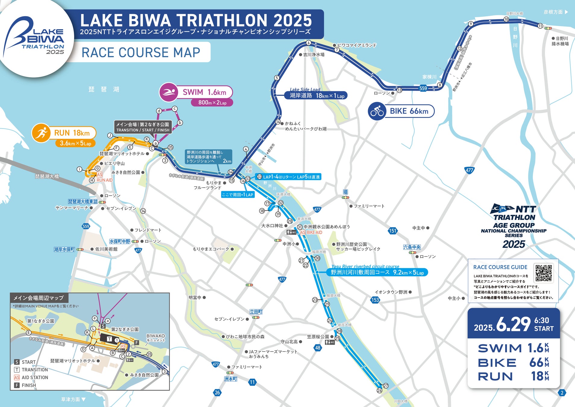 本大会では、日本一の湖・琵琶湖を舞台に、滋賀県守山市・野洲市・近江八幡市をコースとしています。日本のトライアスロンブームの火付け役となった日本最大の湖・琵琶湖での1.6kmのスイムコース、琵琶湖沿いを走る湖岸道路・往復20kmを中心とし、野洲川のフラットな河川敷を周回する66kmのバイクコース、琵琶湖とその奥に比叡の山々を望み、琵琶湖の風を感じながら地域の皆さんの声援に囲まれる18kmのランコースからなる、まさに"This is Biwako"と言えるコースです。