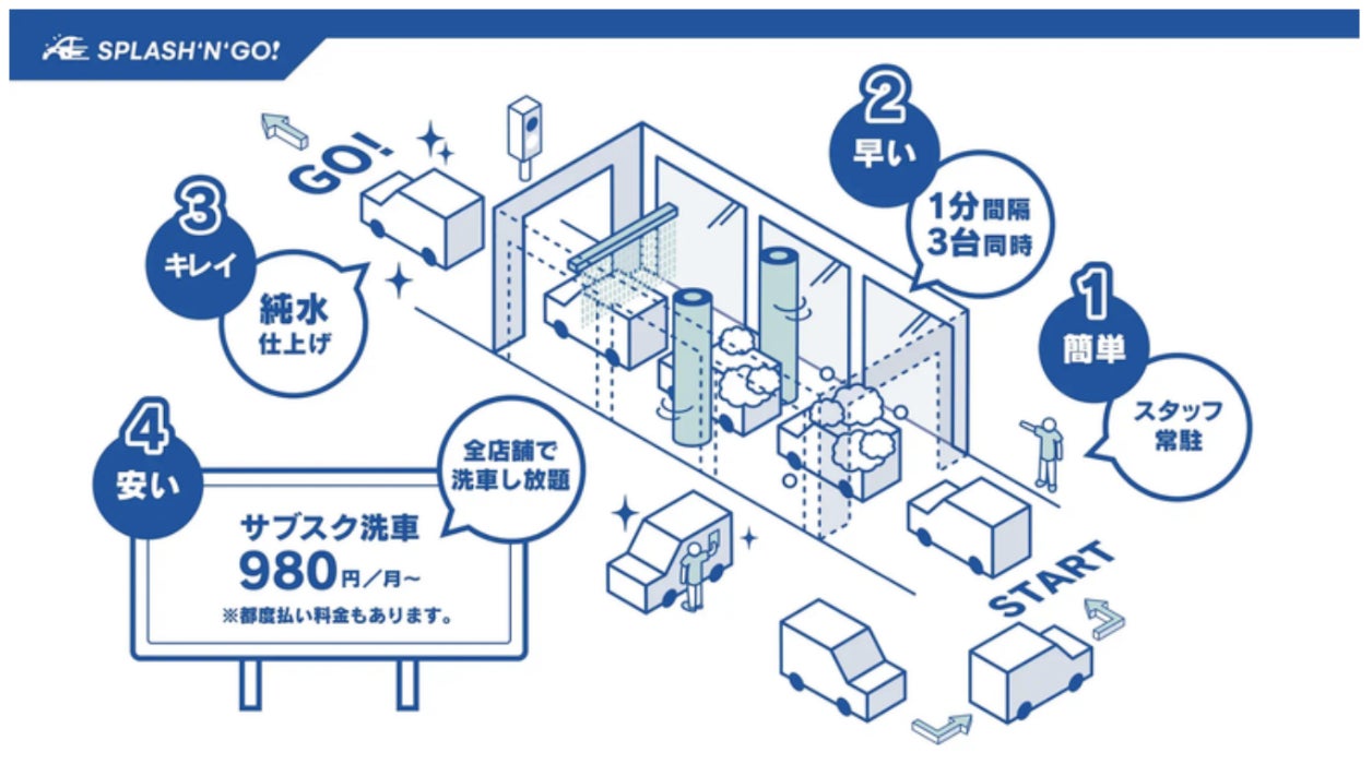 "1分に1台"の圧倒的処理能力で、「面倒な洗車」を「スマートな時短習慣」に変える、スプラッシュンゴーの革命的な洗車体験。手ぶらでOK。月額のサブスクプランも期間限定・初月139円(税込)から