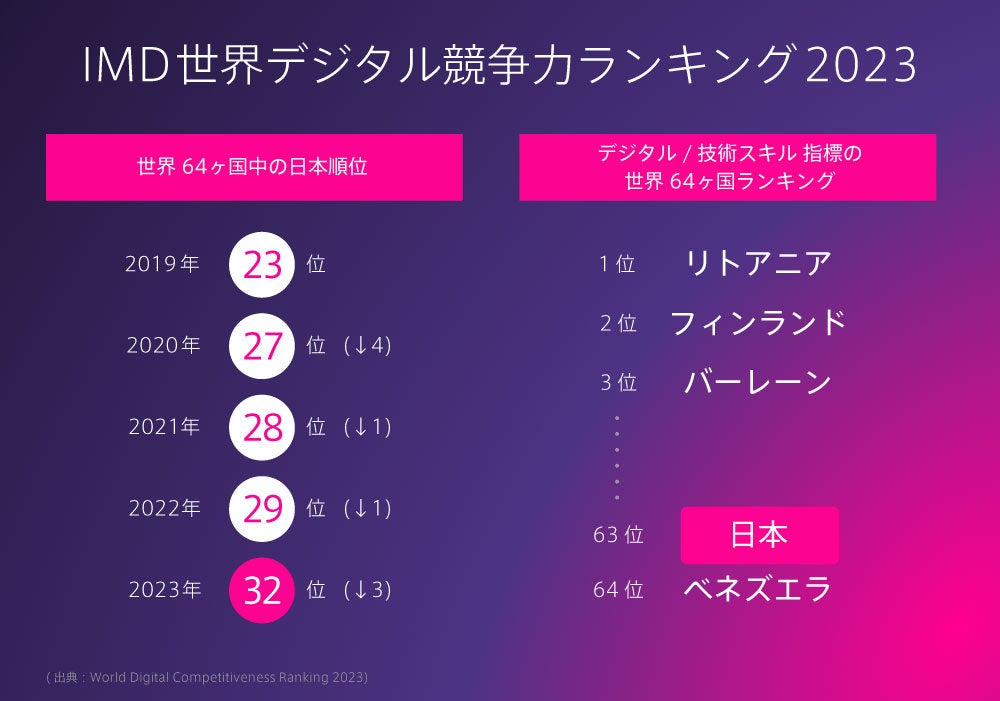 2023年11月に発表された「IMD世界デジタル競争力ランキング」によると、日本のデジタル競争力は世界64ヶ国中32位となり、前年調査から順位を3つ下げ、2017年の調査開始以降過去最低となりました。(APAC領域では14ヶ国中8位)。
