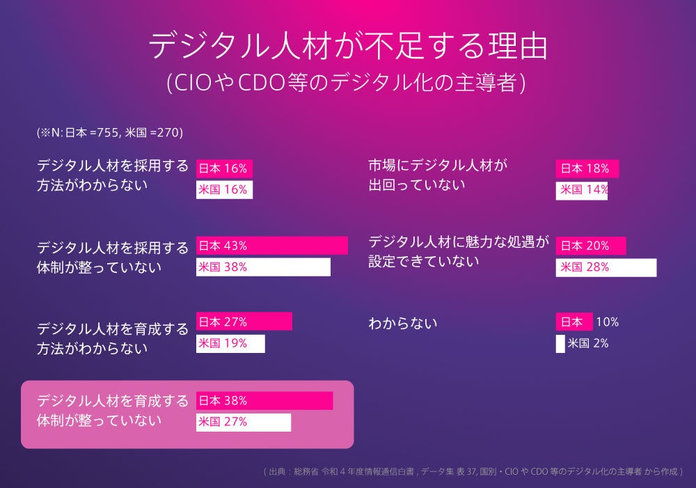 このようにデジタル人材の不足は明らかですが、総務省のデータによると、日本は米国に比べ「デジタル人材を育成する体制が整っていない」と報告されています。