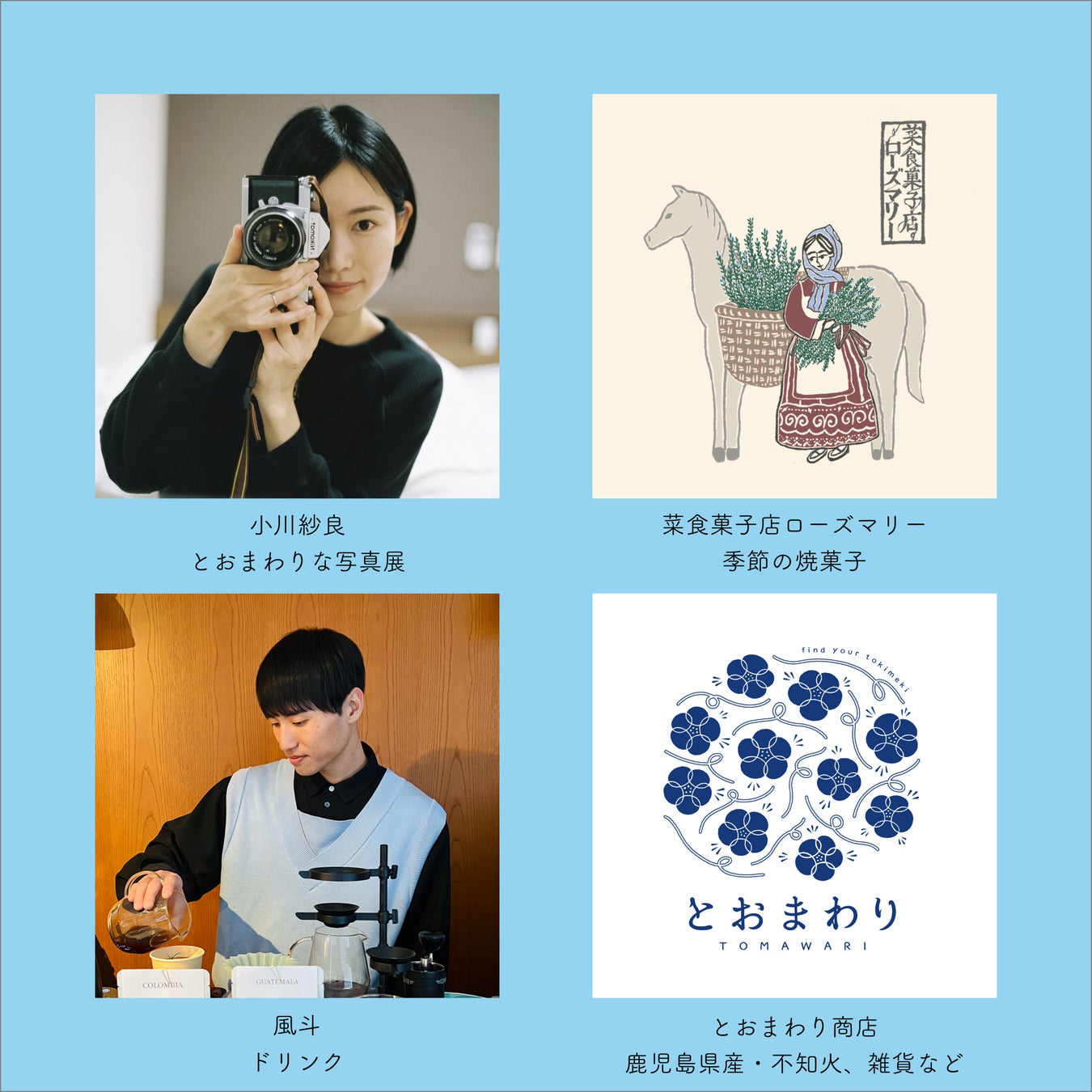 とおまわり代表・小川紗良が各地で撮影したフィルム写真を、「ときめく遠回り 」というテーマでセレクトした写真展や、「菜食菓子店ローズマリー」による季節の食材を使ったヴィーガン菓子、年に一度のスローマガジン「とおまわり」創刊号の発売など。南国の太陽をたっぷりあびた、鹿児島県産・不知火(しらぬい)の販売もあります。春のおでかけに、ぜひゆったりとお楽しみください。
