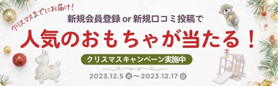 2023 ベスベビ発表を記念して、新規会員登録または新規口コミ投稿をしていただいた方を対象に、お子さまが喜ぶクリスマスプレゼントが抽選で当たるキャンペーンを実施します。